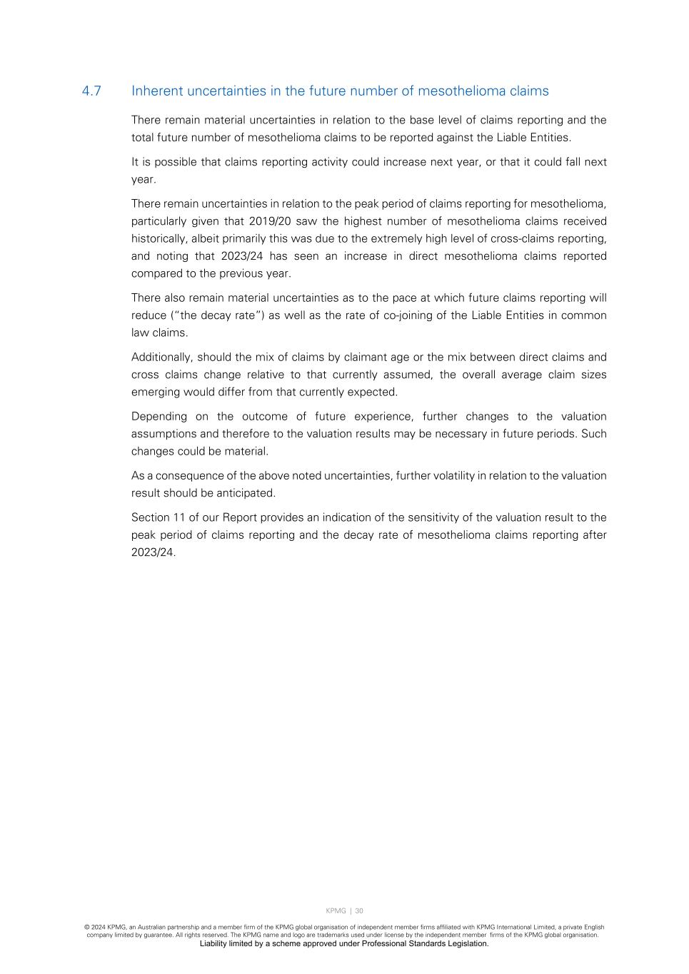 KPMG | 30 © 2024 KPMG, an Australian partnership and a member firm of the KPMG global organisation of independent member firms affiliated with KPMG International Limited, a private English company limited by guarantee. All rights reserved. The KPMG name and logo are trademarks used under license by the independent member firms of the KPMG global organisation. Liability limited by a scheme approved under Professional Standards Legislation. 4.7 Inherent uncertainties in the future number of mesothelioma claims There remain material uncertainties in relation to the base level of claims reporting and the total future number of mesothelioma claims to be reported against the Liable Entities. It is possible that claims reporting activity could increase next year, or that it could fall next year. There remain uncertainties in relation to the peak period of claims reporting for mesothelioma, particularly given that 2019/20 saw the highest number of mesothelioma claims received historically, albeit primarily this was due to the extremely high level of cross-claims reporting, and noting that 2023/24 has seen an increase in direct mesothelioma claims reported compared to the previous year. There also remain material uncertainties as to the pace at which future claims reporting will reduce (“the decay rate”) as well as the rate of co-joining of the Liable Entities in common law claims. Additionally, should the mix of claims by claimant age or the mix between direct claims and cross claims change relative to that currently assumed, the overall average claim sizes emerging would differ from that currently expected. Depending on the outcome of future experience, further changes to the valuation assumptions and therefore to the valuation results may be necessary in future periods. Such changes could be material. As a consequence of the above noted uncertainties, further volatility in relation to the valuation result should be anticipated. Section 11 of our Report provides an indication of the sensitivity of the valuation result to the peak period of claims reporting and the decay rate of mesothelioma claims reporting after 2023/24.