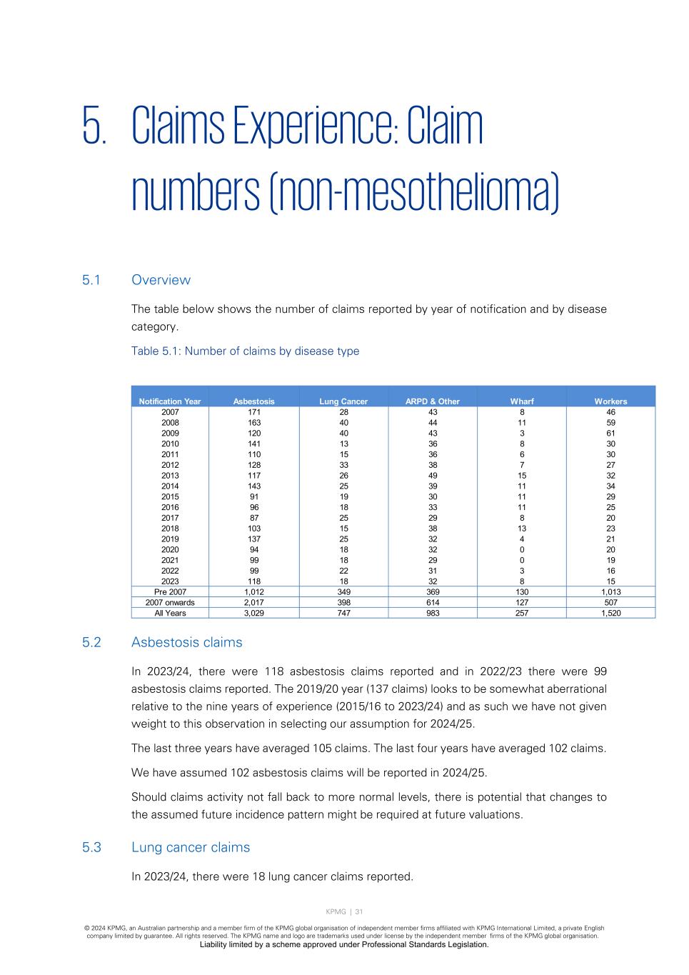 KPMG | 31 © 2024 KPMG, an Australian partnership and a member firm of the KPMG global organisation of independent member firms affiliated with KPMG International Limited, a private English company limited by guarantee. All rights reserved. The KPMG name and logo are trademarks used under license by the independent member firms of the KPMG global organisation. Liability limited by a scheme approved under Professional Standards Legislation. 5. Claims Experience: Claim numbers (non-mesothelioma) 5.1 Overview The table below shows the number of claims reported by year of notification and by disease category. Table 5.1: Number of claims by disease type 5.2 Asbestosis claims In 2023/24, there were 118 asbestosis claims reported and in 2022/23 there were 99 asbestosis claims reported. The 2019/20 year (137 claims) looks to be somewhat aberrational relative to the nine years of experience (2015/16 to 2023/24) and as such we have not given weight to this observation in selecting our assumption for 2024/25. The last three years have averaged 105 claims. The last four years have averaged 102 claims. We have assumed 102 asbestosis claims will be reported in 2024/25. Should claims activity not fall back to more normal levels, there is potential that changes to the assumed future incidence pattern might be required at future valuations. 5.3 Lung cancer claims In 2023/24, there were 18 lung cancer claims reported. Notification Year Asbestosis Lung Cancer ARPD & Other Wharf Workers 2007 171 28 43 8 46 2008 163 40 44 11 59 2009 120 40 43 3 61 2010 141 13 36 8 30 2011 110 15 36 6 30 2012 128 33 38 7 27 2013 117 26 49 15 32 2014 143 25 39 11 34 2015 91 19 30 11 29 2016 96 18 33 11 25 2017 87 25 29 8 20 2018 103 15 38 13 23 2019 137 25 32 4 21 2020 94 18 32 0 20 2021 99 18 29 0 19 2022 99 22 31 3 16 2023 118 18 32 8 15 Pre 2007 1,012 349 369 130 1,013 2007 onwards 2,017 398 614 127 507 All Years 3,029 747 983 257 1,520