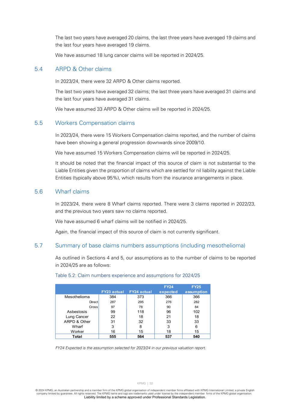 KPMG | 32 © 2024 KPMG, an Australian partnership and a member firm of the KPMG global organisation of independent member firms affiliated with KPMG International Limited, a private English company limited by guarantee. All rights reserved. The KPMG name and logo are trademarks used under license by the independent member firms of the KPMG global organisation. Liability limited by a scheme approved under Professional Standards Legislation. The last two years have averaged 20 claims, the last three years have averaged 19 claims and the last four years have averaged 19 claims. We have assumed 18 lung cancer claims will be reported in 2024/25. 5.4 ARPD & Other claims In 2023/24, there were 32 ARPD & Other claims reported. The last two years have averaged 32 claims; the last three years have averaged 31 claims and the last four years have averaged 31 claims. We have assumed 33 ARPD & Other claims will be reported in 2024/25. 5.5 Workers Compensation claims In 2023/24, there were 15 Workers Compensation claims reported, and the number of claims have been showing a general progression downwards since 2009/10. We have assumed 15 Workers Compensation claims will be reported in 2024/25. It should be noted that the financial impact of this source of claim is not substantial to the Liable Entities given the proportion of claims which are settled for nil liability against the Liable Entities (typically above 95%), which results from the insurance arrangements in place. 5.6 Wharf claims In 2023/24, there were 8 Wharf claims reported. There were 3 claims reported in 2022/23, and the previous two years saw no claims reported. We have assumed 6 wharf claims will be notified in 2024/25. Again, the financial impact of this source of claim is not currently significant. 5.7 Summary of base claims numbers assumptions (including mesothelioma) As outlined in Sections 4 and 5, our assumptions as to the number of claims to be reported in 2024/25 are as follows: Table 5.2: Claim numbers experience and assumptions for 2024/25 FY24 Expected is the assumption selected for 2023/24 in our previous valuation report. FY23 actual FY24 actual FY24 expected FY25 assumption Mesothelioma 384 373 366 366 Direct 287 295 276 282 Cross 97 78 90 84 Asbestosis 99 118 96 102 Lung Cancer 22 18 21 18 ARPD & Other 31 32 33 33 Wharf 3 8 3 6 Worker 16 15 18 15 Total 555 564 537 540