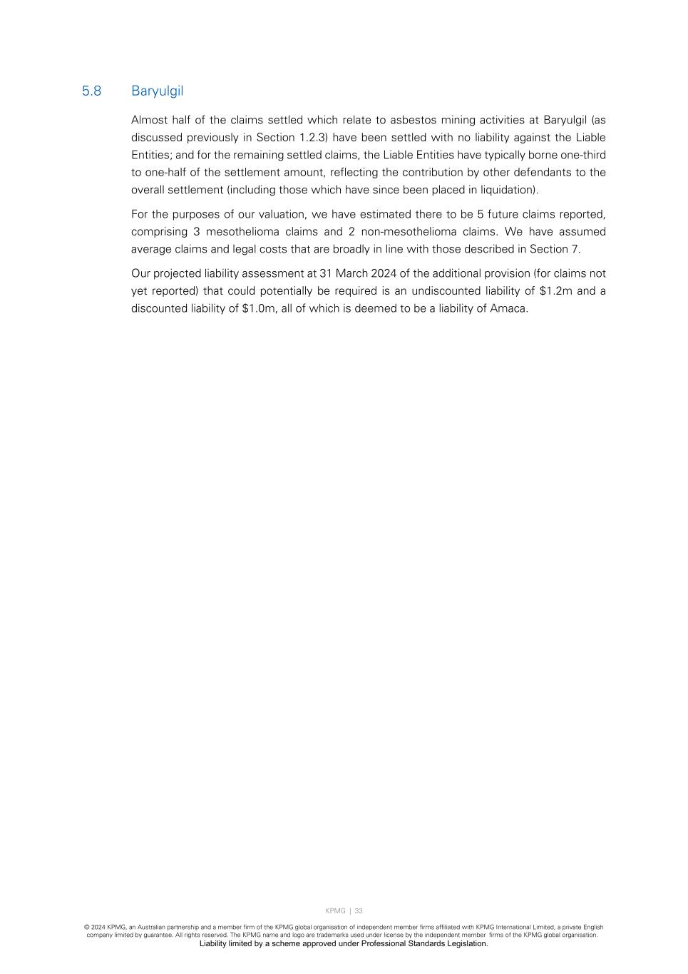 KPMG | 33 © 2024 KPMG, an Australian partnership and a member firm of the KPMG global organisation of independent member firms affiliated with KPMG International Limited, a private English company limited by guarantee. All rights reserved. The KPMG name and logo are trademarks used under license by the independent member firms of the KPMG global organisation. Liability limited by a scheme approved under Professional Standards Legislation. 5.8 Baryulgil Almost half of the claims settled which relate to asbestos mining activities at Baryulgil (as discussed previously in Section 1.2.3) have been settled with no liability against the Liable Entities; and for the remaining settled claims, the Liable Entities have typically borne one-third to one-half of the settlement amount, reflecting the contribution by other defendants to the overall settlement (including those which have since been placed in liquidation). For the purposes of our valuation, we have estimated there to be 5 future claims reported, comprising 3 mesothelioma claims and 2 non-mesothelioma claims. We have assumed average claims and legal costs that are broadly in line with those described in Section 7. Our projected liability assessment at 31 March 2024 of the additional provision (for claims not yet reported) that could potentially be required is an undiscounted liability of $1.2m and a discounted liability of $1.0m, all of which is deemed to be a liability of Amaca.