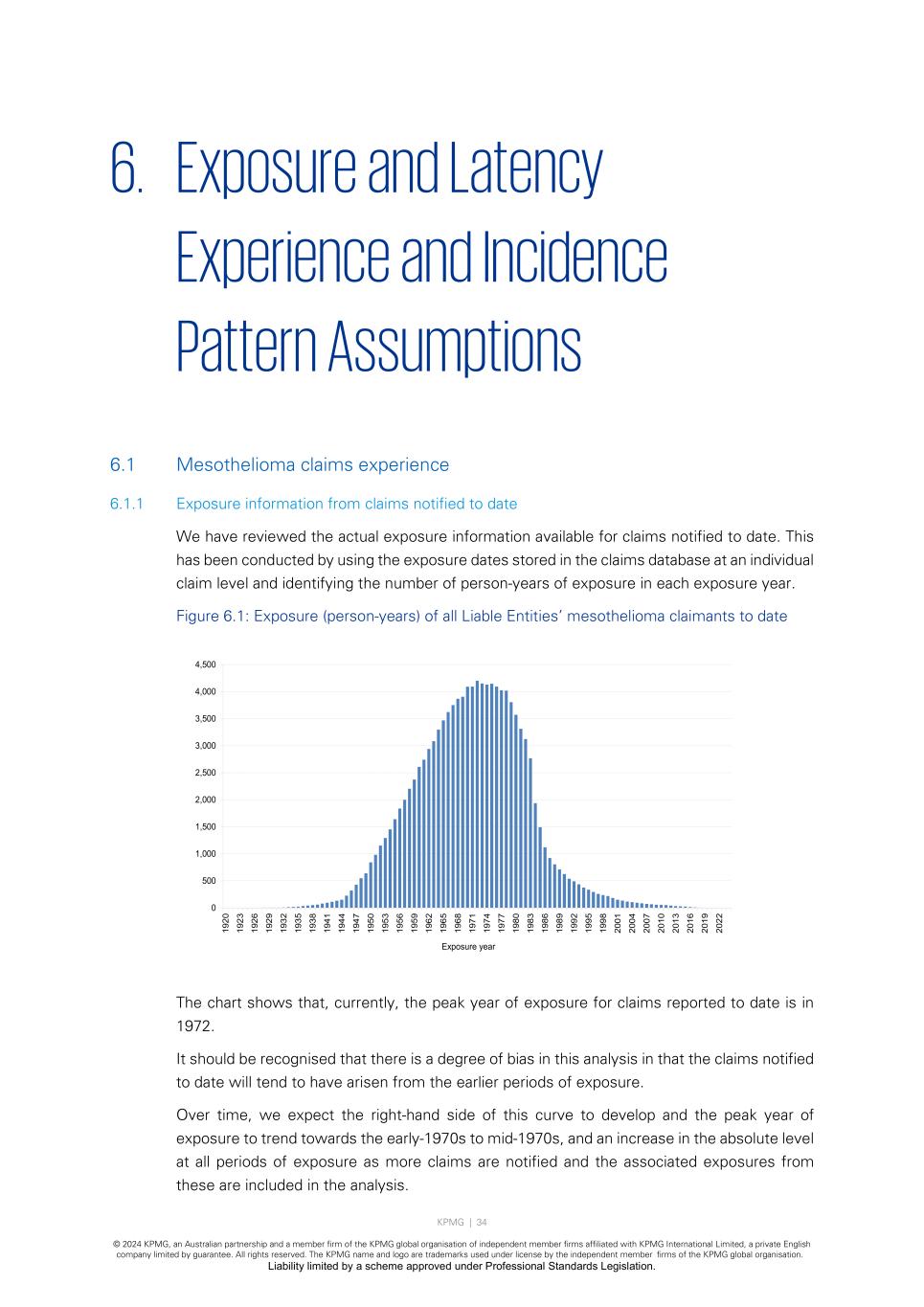 KPMG | 34 © 2024 KPMG, an Australian partnership and a member firm of the KPMG global organisation of independent member firms affiliated with KPMG International Limited, a private English company limited by guarantee. All rights reserved. The KPMG name and logo are trademarks used under license by the independent member firms of the KPMG global organisation. Liability limited by a scheme approved under Professional Standards Legislation. 6. Exposure and Latency Experience and Incidence Pattern Assumptions 6.1 Mesothelioma claims experience 6.1.1 Exposure information from claims notified to date We have reviewed the actual exposure information available for claims notified to date. This has been conducted by using the exposure dates stored in the claims database at an individual claim level and identifying the number of person-years of exposure in each exposure year. Figure 6.1: Exposure (person-years) of all Liable Entities’ mesothelioma claimants to date The chart shows that, currently, the peak year of exposure for claims reported to date is in 1972. It should be recognised that there is a degree of bias in this analysis in that the claims notified to date will tend to have arisen from the earlier periods of exposure. Over time, we expect the right-hand side of this curve to develop and the peak year of exposure to trend towards the early-1970s to mid-1970s, and an increase in the absolute level at all periods of exposure as more claims are notified and the associated exposures from these are included in the analysis. 0 500 1,000 1,500 2,000 2,500 3,000 3,500 4,000 4,500 19 20 19 23 19 26 19 29 19 32 19 35 19 38 19 41 19 44 19 47 19 50 19 53 19 56 19 59 19 62 19 65 19 68 19 71 19 74 19 77 19 80 19 83 19 86 19 89 19 92 19 95 19 98 20 01 20 04 20 07 20 10 20 13 20 16 20 19 20 22 Exposure year