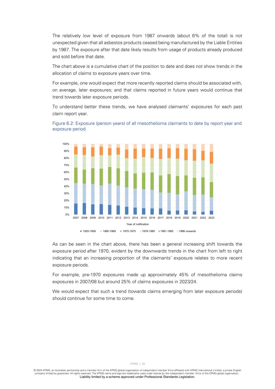 KPMG | 35 © 2024 KPMG, an Australian partnership and a member firm of the KPMG global organisation of independent member firms affiliated with KPMG International Limited, a private English company limited by guarantee. All rights reserved. The KPMG name and logo are trademarks used under license by the independent member firms of the KPMG global organisation. Liability limited by a scheme approved under Professional Standards Legislation. The relatively low level of exposure from 1987 onwards (about 6% of the total) is not unexpected given that all asbestos products ceased being manufactured by the Liable Entities by 1987. The exposure after that date likely results from usage of products already produced and sold before that date. The chart above is a cumulative chart of the position to date and does not show trends in the allocation of claims to exposure years over time. For example, one would expect that more recently reported claims should be associated with, on average, later exposures; and that claims reported in future years would continue that trend towards later exposure periods. To understand better these trends, we have analysed claimants’ exposures for each past claim report year. Figure 6.2: Exposure (person years) of all mesothelioma claimants to date by report year and exposure period As can be seen in the chart above, there has been a general increasing shift towards the exposure period after 1970, evident by the downwards trends in the chart from left to right indicating that an increasing proportion of the claimants’ exposure relates to more recent exposure periods. For example, pre-1970 exposures made up approximately 45% of mesothelioma claims exposures in 2007/08 but around 25% of claims exposures in 2023/24. We would expect that such a trend (towards claims emerging from later exposure periods) should continue for some time to come. 0% 10% 20% 30% 40% 50% 60% 70% 80% 90% 100% 2007 2008 2009 2010 2011 2012 2013 2014 2015 2016 2017 2018 2019 2020 2021 2022 2023 Year of notification 1920-1959 1960-1969 1970-1975 1976-1980 1981-1985 1986 onwards