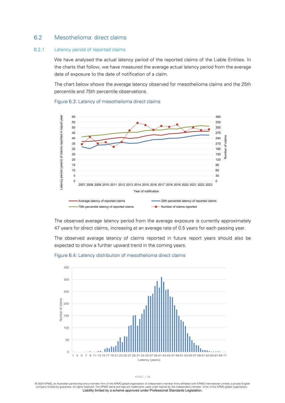 KPMG | 36 © 2024 KPMG, an Australian partnership and a member firm of the KPMG global organisation of independent member firms affiliated with KPMG International Limited, a private English company limited by guarantee. All rights reserved. The KPMG name and logo are trademarks used under license by the independent member firms of the KPMG global organisation. Liability limited by a scheme approved under Professional Standards Legislation. 6.2 Mesothelioma: direct claims 6.2.1 Latency period of reported claims We have analysed the actual latency period of the reported claims of the Liable Entities. In the charts that follow, we have measured the average actual latency period from the average date of exposure to the date of notification of a claim. The chart below shows the average latency observed for mesothelioma claims and the 25th percentile and 75th percentile observations. Figure 6.3: Latency of mesothelioma direct claims The observed average latency period from the average exposure is currently approximately 47 years for direct claims, increasing at an average rate of 0.5 years for each passing year. The observed average latency of claims reported in future report years should also be expected to show a further upward trend in the coming years. Figure 6.4: Latency distribution of mesothelioma direct claims 0 30 60 90 120 150 180 210 240 270 300 330 360 0 5 10 15 20 25 30 35 40 45 50 55 60 2007 2008 2009 2010 2011 2012 2013 2014 2015 2016 2017 2018 2019 2020 2021 2022 2023 N um be r o f c la im s La te nc y pe rio d (y ea rs ) o f c la im s re po rte d in re po rt ye ar Year of notification Average latency of reported claims 25th percentile latency of reported claims 75th percentile latency of reported claims Number of claims reported 0 50 100 150 200 250 300 350 1 3 5 7 9 11 13 15 17 19 21 23 25 27 29 31 33 35 37 39 41 43 45 47 49 51 53 55 57 59 61 63 65 67 69 71 Nu m be r o f c la im s Latency (years)