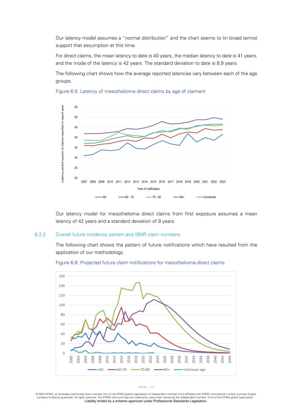 KPMG | 37 © 2024 KPMG, an Australian partnership and a member firm of the KPMG global organisation of independent member firms affiliated with KPMG International Limited, a private English company limited by guarantee. All rights reserved. The KPMG name and logo are trademarks used under license by the independent member firms of the KPMG global organisation. Liability limited by a scheme approved under Professional Standards Legislation. Our latency model assumes a “normal distribution” and the chart seems to (in broad terms) support that assumption at this time. For direct claims, the mean latency to date is 40 years, the median latency to date is 41 years, and the mode of the latency is 42 years. The standard deviation to date is 8.9 years. The following chart shows how the average reported latencies vary between each of the age groups. Figure 6.5: Latency of mesothelioma direct claims by age of claimant Our latency model for mesothelioma direct claims from first exposure assumes a mean latency of 42 years and a standard deviation of 9 years. 6.2.2 Overall future incidence pattern and IBNR claim numbers The following chart shows the pattern of future notifications which have resulted from the application of our methodology. Figure 6.6: Projected future claim notifications for mesothelioma direct claims 20 25 30 35 40 45 50 55 2007 2008 2009 2010 2011 2012 2013 2014 2015 2016 2017 2018 2019 2020 2021 2022 2023La te nc y pe rio d (y ea rs ) of c la im s re po rt ed in r ep or t y ea r Year of notification <60 60 - 70 70 - 80 80+ Combined 0 20 40 60 80 100 120 140 160 20 00 20 02 20 04 20 06 20 08 20 10 20 12 20 14 20 16 20 18 20 20 20 22 20 24 20 26 20 28 20 30 20 32 20 34 20 36 20 38 20 40 20 42 20 44 <60 60-70 70-80 80+ Unknown age