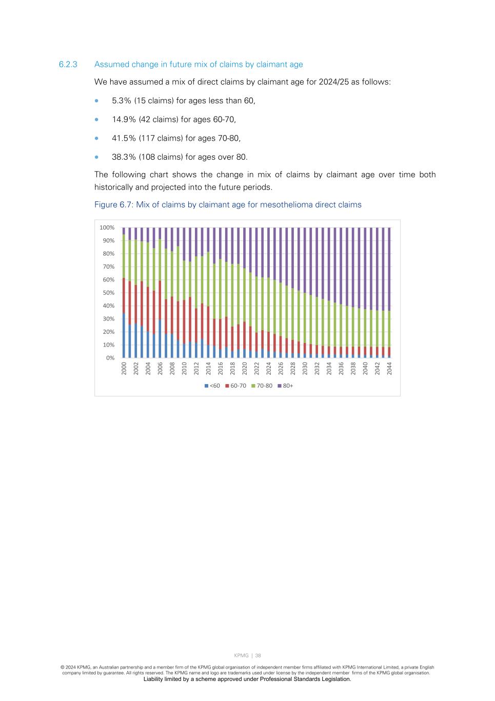 KPMG | 38 © 2024 KPMG, an Australian partnership and a member firm of the KPMG global organisation of independent member firms affiliated with KPMG International Limited, a private English company limited by guarantee. All rights reserved. The KPMG name and logo are trademarks used under license by the independent member firms of the KPMG global organisation. Liability limited by a scheme approved under Professional Standards Legislation. 6.2.3 Assumed change in future mix of claims by claimant age We have assumed a mix of direct claims by claimant age for 2024/25 as follows: • 5.3% (15 claims) for ages less than 60, • 14.9% (42 claims) for ages 60-70, • 41.5% (117 claims) for ages 70-80, • 38.3% (108 claims) for ages over 80. The following chart shows the change in mix of claims by claimant age over time both historically and projected into the future periods. Figure 6.7: Mix of claims by claimant age for mesothelioma direct claims 0% 10% 20% 30% 40% 50% 60% 70% 80% 90% 100% 20 00 20 02 20 04 20 06 20 08 20 10 20 12 20 14 20 16 20 18 20 20 20 22 20 24 20 26 20 28 20 30 20 32 20 34 20 36 20 38 20 40 20 42 20 44 <60 60-70 70-80 80+