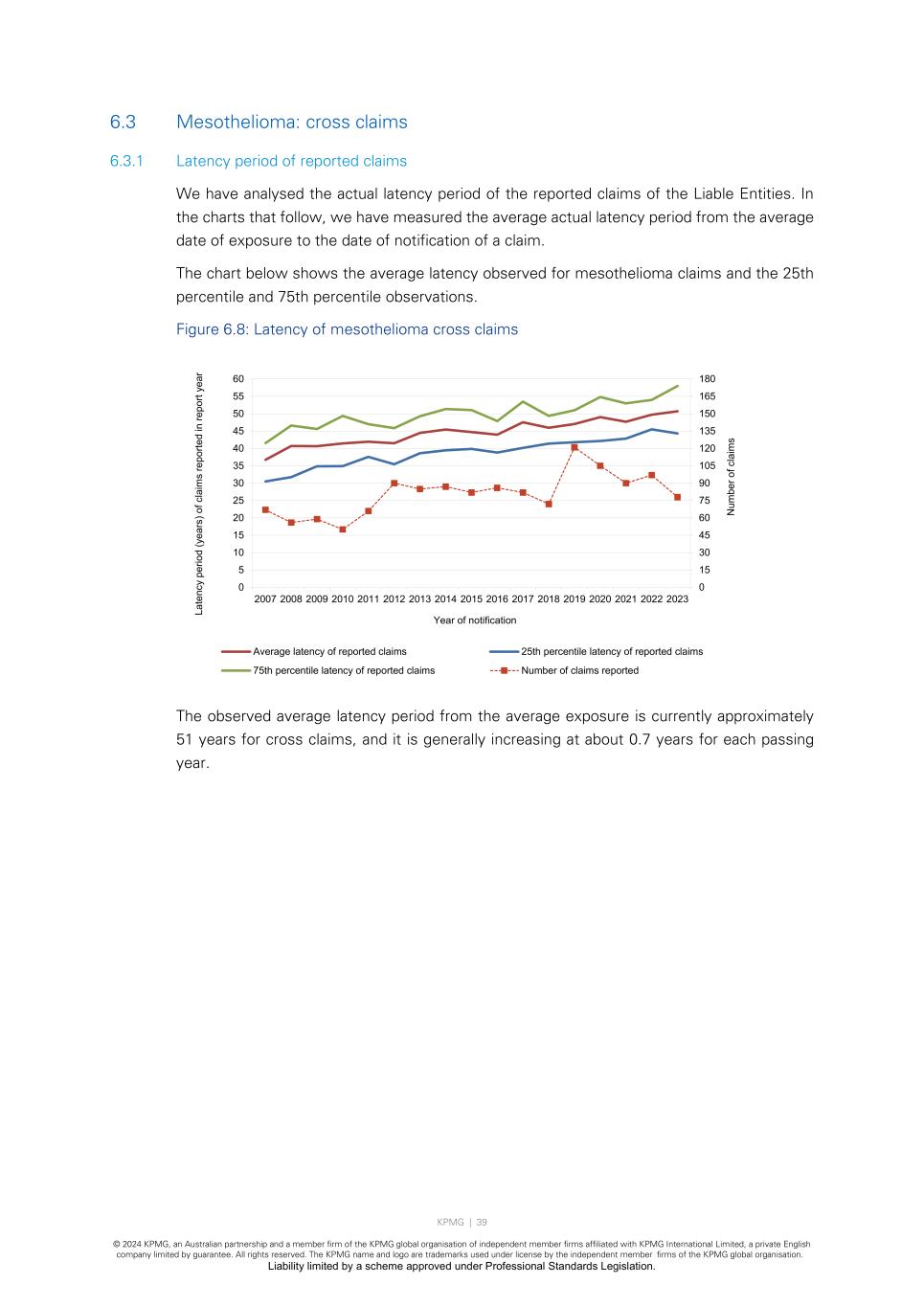 KPMG | 39 © 2024 KPMG, an Australian partnership and a member firm of the KPMG global organisation of independent member firms affiliated with KPMG International Limited, a private English company limited by guarantee. All rights reserved. The KPMG name and logo are trademarks used under license by the independent member firms of the KPMG global organisation. Liability limited by a scheme approved under Professional Standards Legislation. 6.3 Mesothelioma: cross claims 6.3.1 Latency period of reported claims We have analysed the actual latency period of the reported claims of the Liable Entities. In the charts that follow, we have measured the average actual latency period from the average date of exposure to the date of notification of a claim. The chart below shows the average latency observed for mesothelioma claims and the 25th percentile and 75th percentile observations. Figure 6.8: Latency of mesothelioma cross claims The observed average latency period from the average exposure is currently approximately 51 years for cross claims, and it is generally increasing at about 0.7 years for each passing year. 0 15 30 45 60 75 90 105 120 135 150 165 180 0 5 10 15 20 25 30 35 40 45 50 55 60 2007 2008 2009 2010 2011 2012 2013 2014 2015 2016 2017 2018 2019 2020 2021 2022 2023 N um be r o f c la im s La te nc y pe rio d (y ea rs ) o f c la im s re po rte d in re po rt ye ar Year of notification Average latency of reported claims 25th percentile latency of reported claims 75th percentile latency of reported claims Number of claims reported
