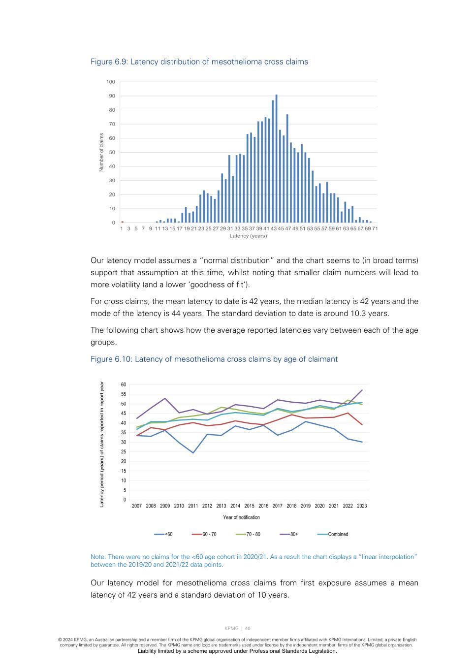 KPMG | 40 © 2024 KPMG, an Australian partnership and a member firm of the KPMG global organisation of independent member firms affiliated with KPMG International Limited, a private English company limited by guarantee. All rights reserved. The KPMG name and logo are trademarks used under license by the independent member firms of the KPMG global organisation. Liability limited by a scheme approved under Professional Standards Legislation. Figure 6.9: Latency distribution of mesothelioma cross claims Our latency model assumes a “normal distribution” and the chart seems to (in broad terms) support that assumption at this time, whilst noting that smaller claim numbers will lead to more volatility (and a lower ‘goodness of fit’). For cross claims, the mean latency to date is 42 years, the median latency is 42 years and the mode of the latency is 44 years. The standard deviation to date is around 10.3 years. The following chart shows how the average reported latencies vary between each of the age groups. Figure 6.10: Latency of mesothelioma cross claims by age of claimant Note: There were no claims for the <60 age cohort in 2020/21. As a result the chart displays a “linear interpolation” between the 2019/20 and 2021/22 data points. Our latency model for mesothelioma cross claims from first exposure assumes a mean latency of 42 years and a standard deviation of 10 years. 0 10 20 30 40 50 60 70 80 90 100 1 3 5 7 9 11 13 15 17 19 21 23 25 27 29 31 33 35 37 39 41 43 45 47 49 51 53 55 57 59 61 63 65 67 69 71 Nu m be r o f c la im s Latency (years) 0 5 10 15 20 25 30 35 40 45 50 55 60 2007 2008 2009 2010 2011 2012 2013 2014 2015 2016 2017 2018 2019 2020 2021 2022 2023La te nc y pe rio d (y ea rs ) of c la im s re po rt ed in r ep or t y ea r Year of notification <60 60 - 70 70 - 80 80+ Combined
