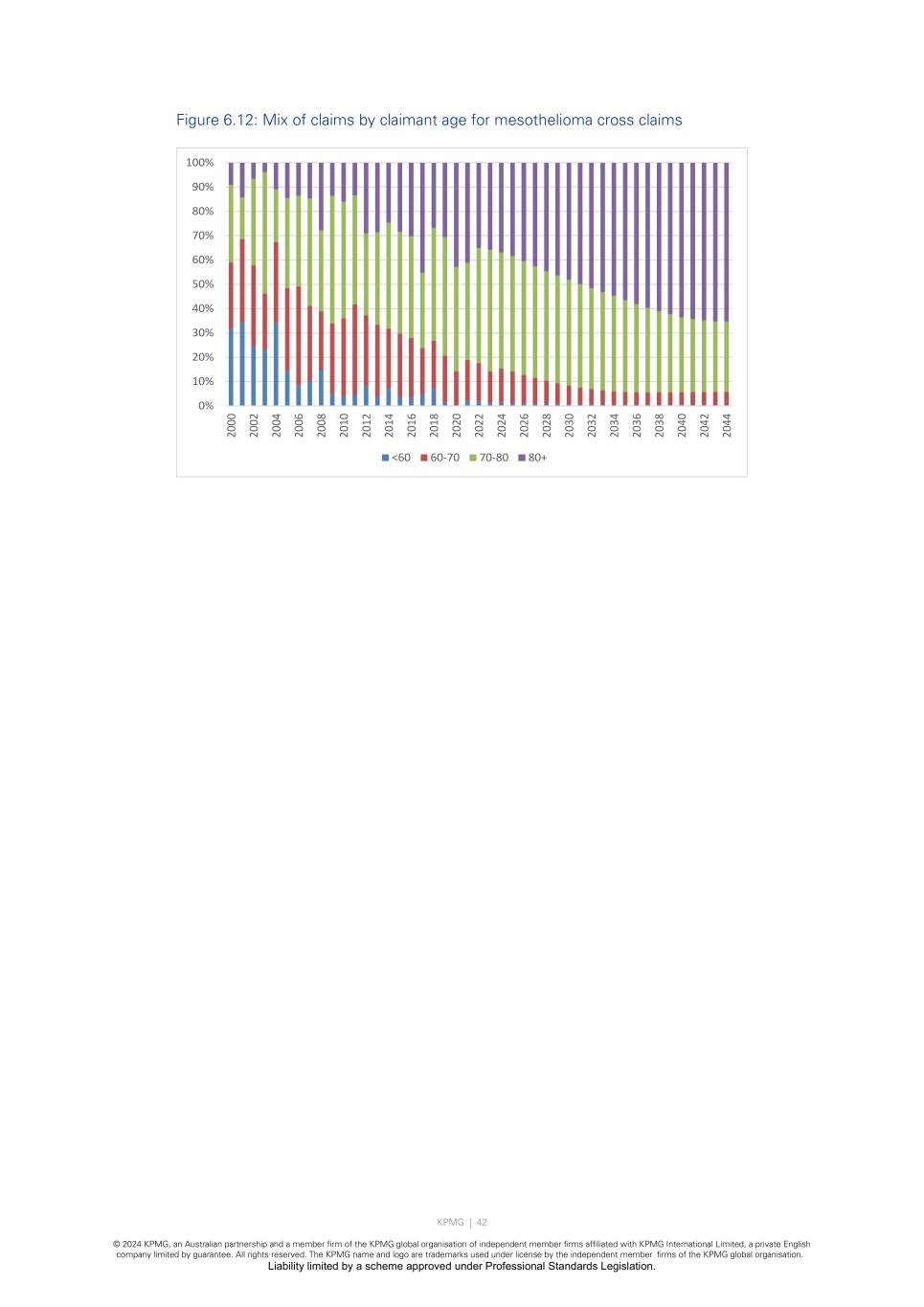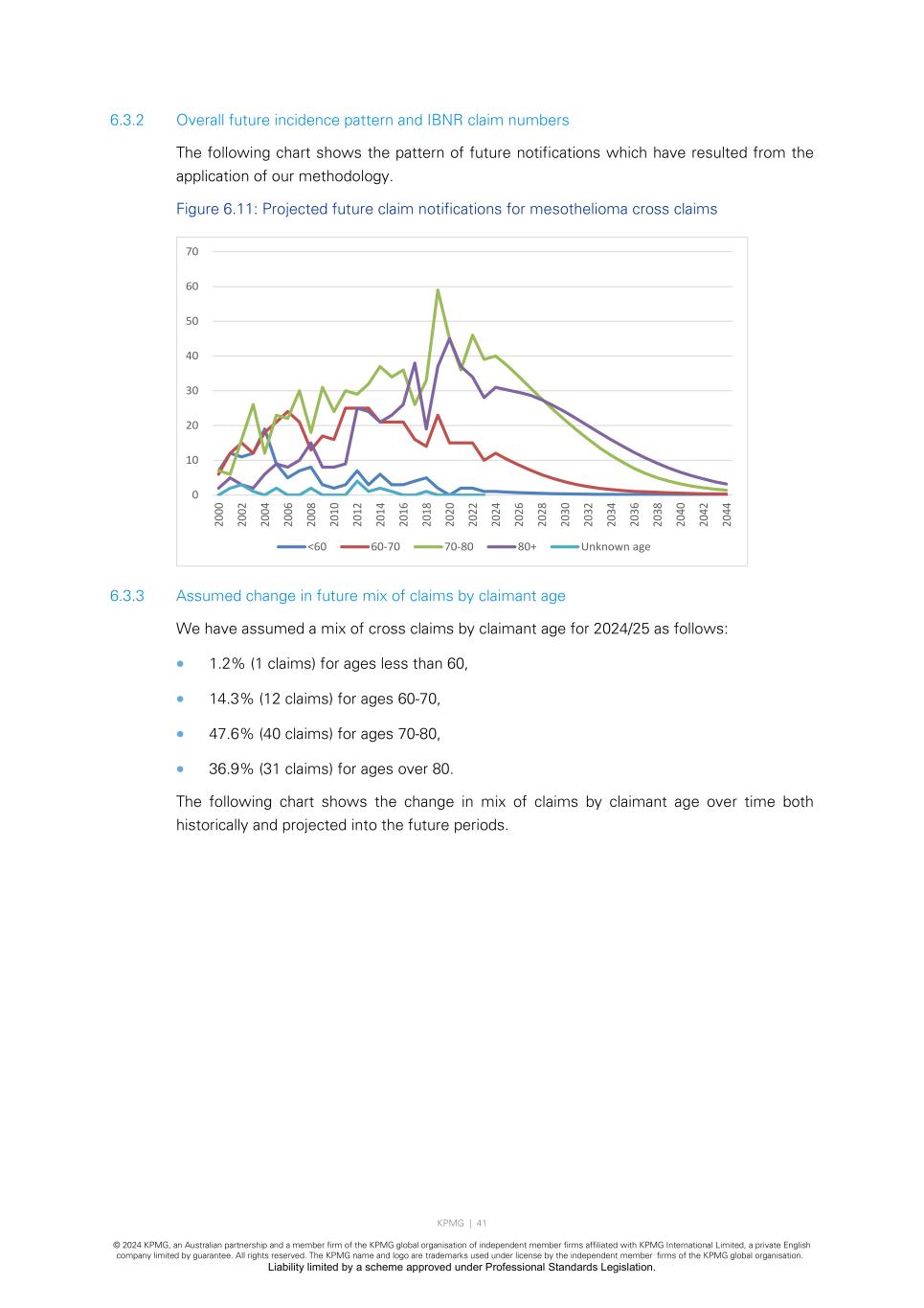 KPMG | 41 © 2024 KPMG, an Australian partnership and a member firm of the KPMG global organisation of independent member firms affiliated with KPMG International Limited, a private English company limited by guarantee. All rights reserved. The KPMG name and logo are trademarks used under license by the independent member firms of the KPMG global organisation. Liability limited by a scheme approved under Professional Standards Legislation. 6.3.2 Overall future incidence pattern and IBNR claim numbers The following chart shows the pattern of future notifications which have resulted from the application of our methodology. Figure 6.11: Projected future claim notifications for mesothelioma cross claims 6.3.3 Assumed change in future mix of claims by claimant age We have assumed a mix of cross claims by claimant age for 2024/25 as follows: • 1.2% (1 claims) for ages less than 60, • 14.3% (12 claims) for ages 60-70, • 47.6% (40 claims) for ages 70-80, • 36.9% (31 claims) for ages over 80. The following chart shows the change in mix of claims by claimant age over time both historically and projected into the future periods. 0 10 20 30 40 50 60 70 20 00 20 02 20 04 20 06 20 08 20 10 20 12 20 14 20 16 20 18 20 20 20 22 20 24 20 26 20 28 20 30 20 32 20 34 20 36 20 38 20 40 20 42 20 44 <60 60-70 70-80 80+ Unknown age
