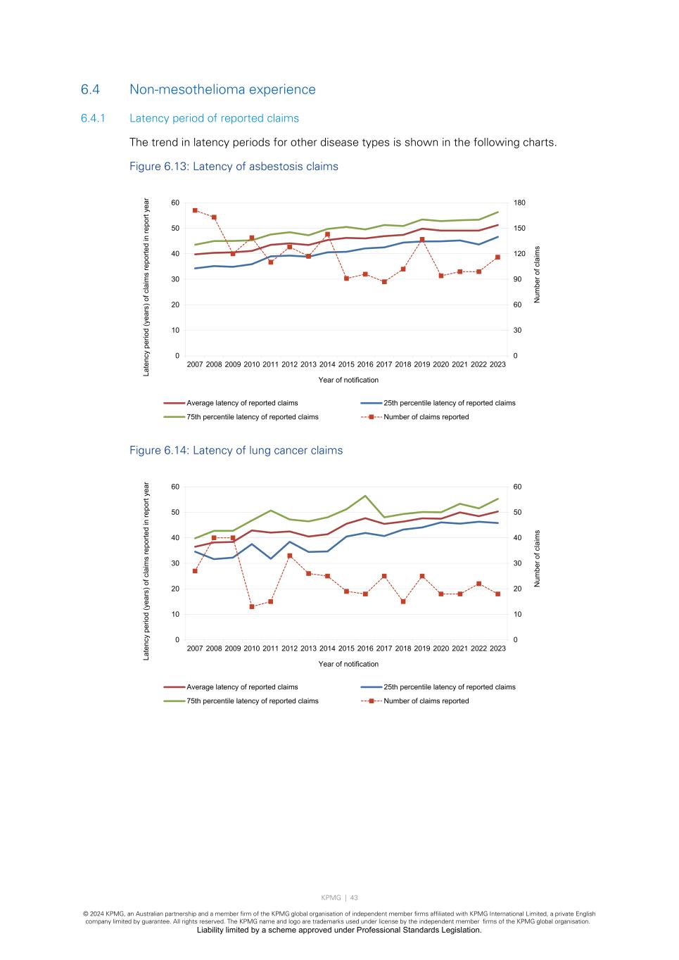 KPMG | 43 © 2024 KPMG, an Australian partnership and a member firm of the KPMG global organisation of independent member firms affiliated with KPMG International Limited, a private English company limited by guarantee. All rights reserved. The KPMG name and logo are trademarks used under license by the independent member firms of the KPMG global organisation. Liability limited by a scheme approved under Professional Standards Legislation. 6.4 Non-mesothelioma experience 6.4.1 Latency period of reported claims The trend in latency periods for other disease types is shown in the following charts. Figure 6.13: Latency of asbestosis claims Figure 6.14: Latency of lung cancer claims 0 30 60 90 120 150 180 0 10 20 30 40 50 60 2007 2008 2009 2010 2011 2012 2013 2014 2015 2016 2017 2018 2019 2020 2021 2022 2023 N um be r o f c la im s La te nc y pe rio d (y ea rs ) o f c la im s re po rte d in re po rt ye ar Year of notification Average latency of reported claims 25th percentile latency of reported claims 75th percentile latency of reported claims Number of claims reported 0 10 20 30 40 50 60 0 10 20 30 40 50 60 2007 2008 2009 2010 2011 2012 2013 2014 2015 2016 2017 2018 2019 2020 2021 2022 2023 N um be r o f c la im s La te nc y pe rio d (y ea rs ) o f c la im s re po rte d in re po rt ye ar Year of notification Average latency of reported claims 25th percentile latency of reported claims 75th percentile latency of reported claims Number of claims reported
