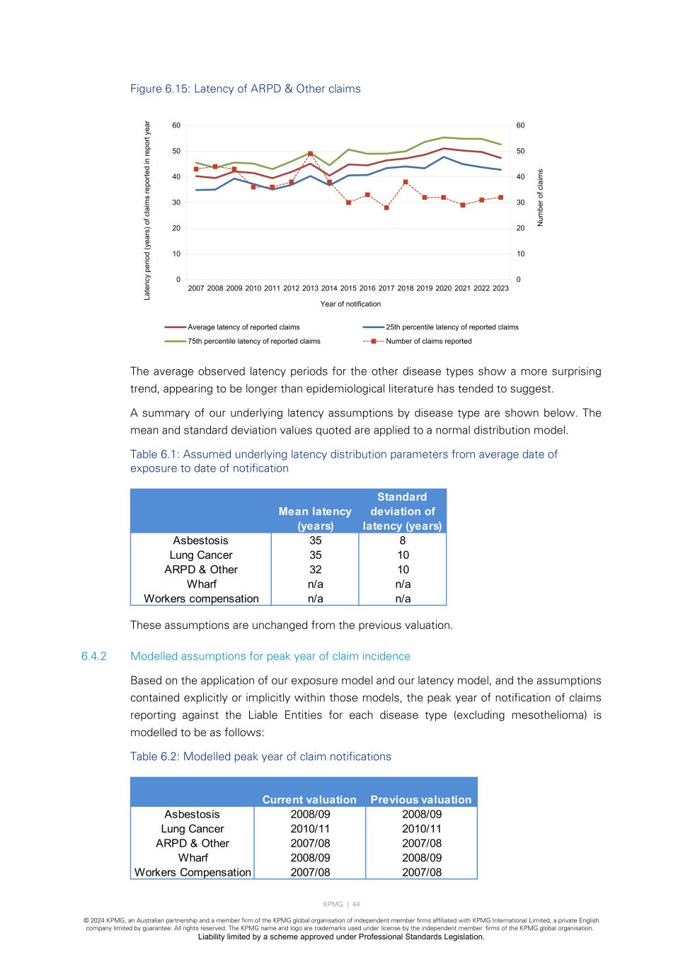 KPMG | 44 © 2024 KPMG, an Australian partnership and a member firm of the KPMG global organisation of independent member firms affiliated with KPMG International Limited, a private English company limited by guarantee. All rights reserved. The KPMG name and logo are trademarks used under license by the independent member firms of the KPMG global organisation. Liability limited by a scheme approved under Professional Standards Legislation. Figure 6.15: Latency of ARPD & Other claims The average observed latency periods for the other disease types show a more surprising trend, appearing to be longer than epidemiological literature has tended to suggest. A summary of our underlying latency assumptions by disease type are shown below. The mean and standard deviation values quoted are applied to a normal distribution model. Table 6.1: Assumed underlying latency distribution parameters from average date of exposure to date of notification These assumptions are unchanged from the previous valuation. 6.4.2 Modelled assumptions for peak year of claim incidence Based on the application of our exposure model and our latency model, and the assumptions contained explicitly or implicitly within those models, the peak year of notification of claims reporting against the Liable Entities for each disease type (excluding mesothelioma) is modelled to be as follows: Table 6.2: Modelled peak year of claim notifications 0 10 20 30 40 50 60 0 10 20 30 40 50 60 2007 2008 2009 2010 2011 2012 2013 2014 2015 2016 2017 2018 2019 2020 2021 2022 2023 N um be r o f c la im s La te nc y pe rio d (y ea rs ) o f c la im s re po rte d in re po rt ye ar Year of notification Average latency of reported claims 25th percentile latency of reported claims 75th percentile latency of reported claims Number of claims reported Mean latency (years) Standard deviation of latency (years) Asbestosis 35 8 Lung Cancer 35 10 ARPD & Other 32 10 Wharf n/a n/a Workers compensation n/a n/a Current valuation Previous valuation Asbestosis 2008/09 2008/09 Lung Cancer 2010/11 2010/11 ARPD & Other 2007/08 2007/08 Wharf 2008/09 2008/09 Workers Compensation 2007/08 2007/08