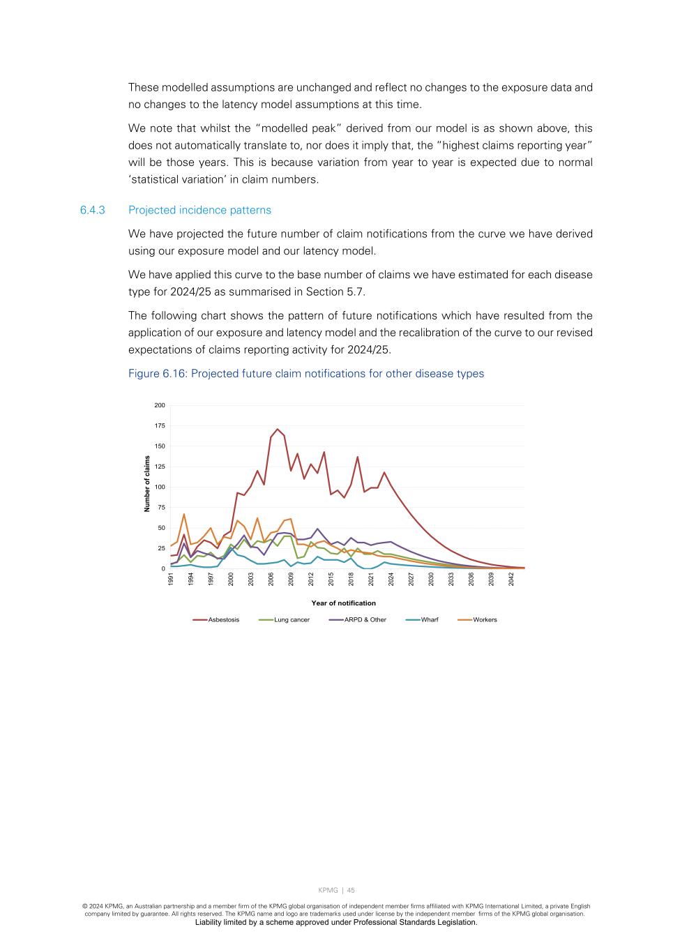 KPMG | 45 © 2024 KPMG, an Australian partnership and a member firm of the KPMG global organisation of independent member firms affiliated with KPMG International Limited, a private English company limited by guarantee. All rights reserved. The KPMG name and logo are trademarks used under license by the independent member firms of the KPMG global organisation. Liability limited by a scheme approved under Professional Standards Legislation. These modelled assumptions are unchanged and reflect no changes to the exposure data and no changes to the latency model assumptions at this time. We note that whilst the “modelled peak” derived from our model is as shown above, this does not automatically translate to, nor does it imply that, the “highest claims reporting year” will be those years. This is because variation from year to year is expected due to normal ‘statistical variation’ in claim numbers. 6.4.3 Projected incidence patterns We have projected the future number of claim notifications from the curve we have derived using our exposure model and our latency model. We have applied this curve to the base number of claims we have estimated for each disease type for 2024/25 as summarised in Section 5.7. The following chart shows the pattern of future notifications which have resulted from the application of our exposure and latency model and the recalibration of the curve to our revised expectations of claims reporting activity for 2024/25. Figure 6.16: Projected future claim notifications for other disease types 0 25 50 75 100 125 150 175 200 19 91 19 94 19 97 20 00 20 03 20 06 20 09 20 12 20 15 20 18 20 21 20 24 20 27 20 30 20 33 20 36 20 39 20 42 Nu m be r o f c la im s Year of notification Asbestosis Lung cancer ARPD & Other Wharf Workers
