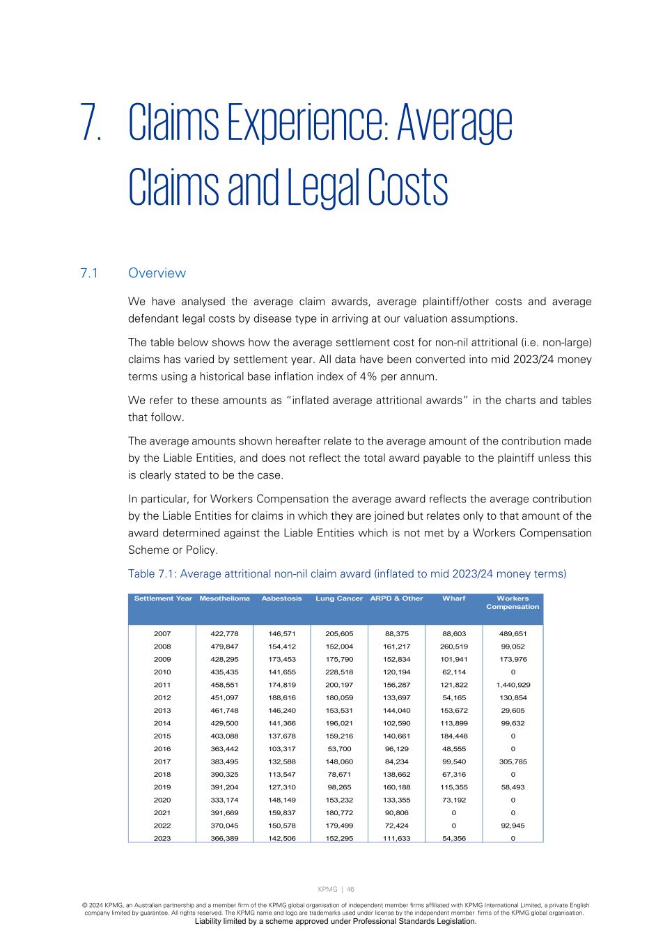 KPMG | 46 © 2024 KPMG, an Australian partnership and a member firm of the KPMG global organisation of independent member firms affiliated with KPMG International Limited, a private English company limited by guarantee. All rights reserved. The KPMG name and logo are trademarks used under license by the independent member firms of the KPMG global organisation. Liability limited by a scheme approved under Professional Standards Legislation. 7. Claims Experience: Average Claims and Legal Costs 7.1 Overview We have analysed the average claim awards, average plaintiff/other costs and average defendant legal costs by disease type in arriving at our valuation assumptions. The table below shows how the average settlement cost for non-nil attritional (i.e. non-large) claims has varied by settlement year. All data have been converted into mid 2023/24 money terms using a historical base inflation index of 4% per annum. We refer to these amounts as “inflated average attritional awards” in the charts and tables that follow. The average amounts shown hereafter relate to the average amount of the contribution made by the Liable Entities, and does not reflect the total award payable to the plaintiff unless this is clearly stated to be the case. In particular, for Workers Compensation the average award reflects the average contribution by the Liable Entities for claims in which they are joined but relates only to that amount of the award determined against the Liable Entities which is not met by a Workers Compensation Scheme or Policy. Table 7.1: Average attritional non-nil claim award (inflated to mid 2023/24 money terms) Settlement Year Mesothelioma Asbestosis Lung Cancer ARPD & Other Wharf Workers Compensation 2007 422,778 146,571 205,605 88,375 88,603 489,651 2008 479,847 154,412 152,004 161,217 260,519 99,052 2009 428,295 173,453 175,790 152,834 101,941 173,976 2010 435,435 141,655 228,518 120,194 62,114 0 2011 458,551 174,819 200,197 156,287 121,822 1,440,929 2012 451,097 188,616 180,059 133,697 54,165 130,854 2013 461,748 146,240 153,531 144,040 153,672 29,605 2014 429,500 141,366 196,021 102,590 113,899 99,632 2015 403,088 137,678 159,216 140,661 184,448 0 2016 363,442 103,317 53,700 96,129 48,555 0 2017 383,495 132,588 148,060 84,234 99,540 305,785 2018 390,325 113,547 78,671 138,662 67,316 0 2019 391,204 127,310 98,265 160,188 115,355 58,493 2020 333,174 148,149 153,232 133,355 73,192 0 2021 391,669 159,837 180,772 90,806 0 0 2022 370,045 150,578 179,499 72,424 0 92,945 2023 366,389 142,506 152,295 111,633 54,356 0
