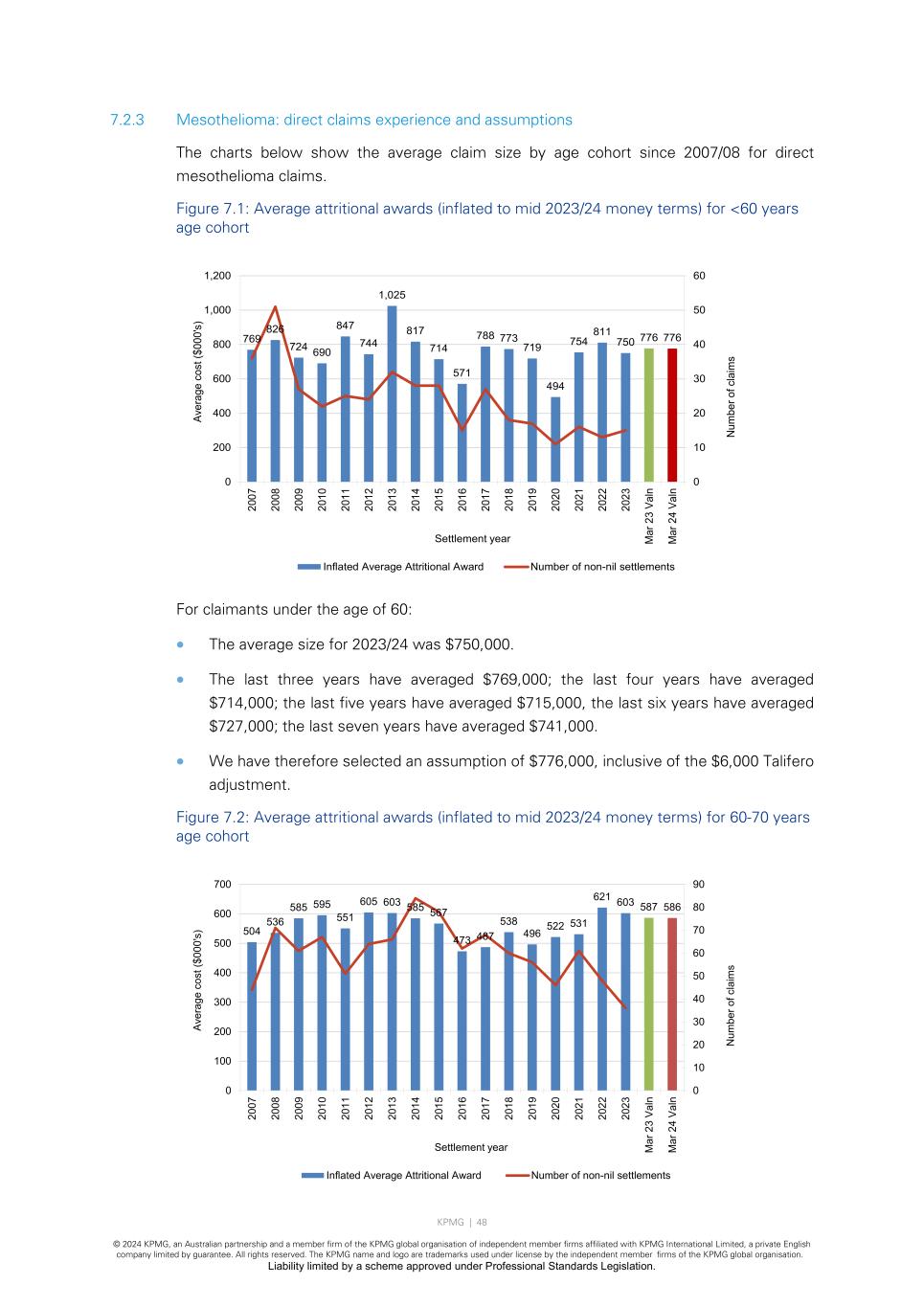 KPMG | 48 © 2024 KPMG, an Australian partnership and a member firm of the KPMG global organisation of independent member firms affiliated with KPMG International Limited, a private English company limited by guarantee. All rights reserved. The KPMG name and logo are trademarks used under license by the independent member firms of the KPMG global organisation. Liability limited by a scheme approved under Professional Standards Legislation. 7.2.3 Mesothelioma: direct claims experience and assumptions The charts below show the average claim size by age cohort since 2007/08 for direct mesothelioma claims. Figure 7.1: Average attritional awards (inflated to mid 2023/24 money terms) for <60 years age cohort For claimants under the age of 60: • The average size for 2023/24 was $750,000. • The last three years have averaged $769,000; the last four years have averaged $714,000; the last five years have averaged $715,000, the last six years have averaged $727,000; the last seven years have averaged $741,000. • We have therefore selected an assumption of $776,000, inclusive of the $6,000 Talifero adjustment. Figure 7.2: Average attritional awards (inflated to mid 2023/24 money terms) for 60-70 years age cohort 769 826 724 690 847 744 1,025 817 714 571 788 773 719 494 754 811 750 776 776 0 10 20 30 40 50 60 0 200 400 600 800 1,000 1,200 20 07 20 08 20 09 20 10 20 11 20 12 20 13 20 14 20 15 20 16 20 17 20 18 20 19 20 20 20 21 20 22 20 23 M ar 2 3 Va ln M ar 2 4 Va ln N um be r o f c la im s Av er ag e co st ($ 00 0' s) Settlement year Inflated Average Attritional Award Number of non-nil settlements 504 536 585 595 551 605 603 585 567 473 487 538 496 522 531 621 603 587 586 0 10 20 30 40 50 60 70 80 90 0 100 200 300 400 500 600 700 20 07 20 08 20 09 20 10 20 11 20 12 20 13 20 14 20 15 20 16 20 17 20 18 20 19 20 20 20 21 20 22 20 23 M ar 2 3 Va ln M ar 2 4 Va ln N um be r o f c la im s Av er ag e co st ($ 00 0' s) Settlement year Inflated Average Attritional Award Number of non-nil settlements