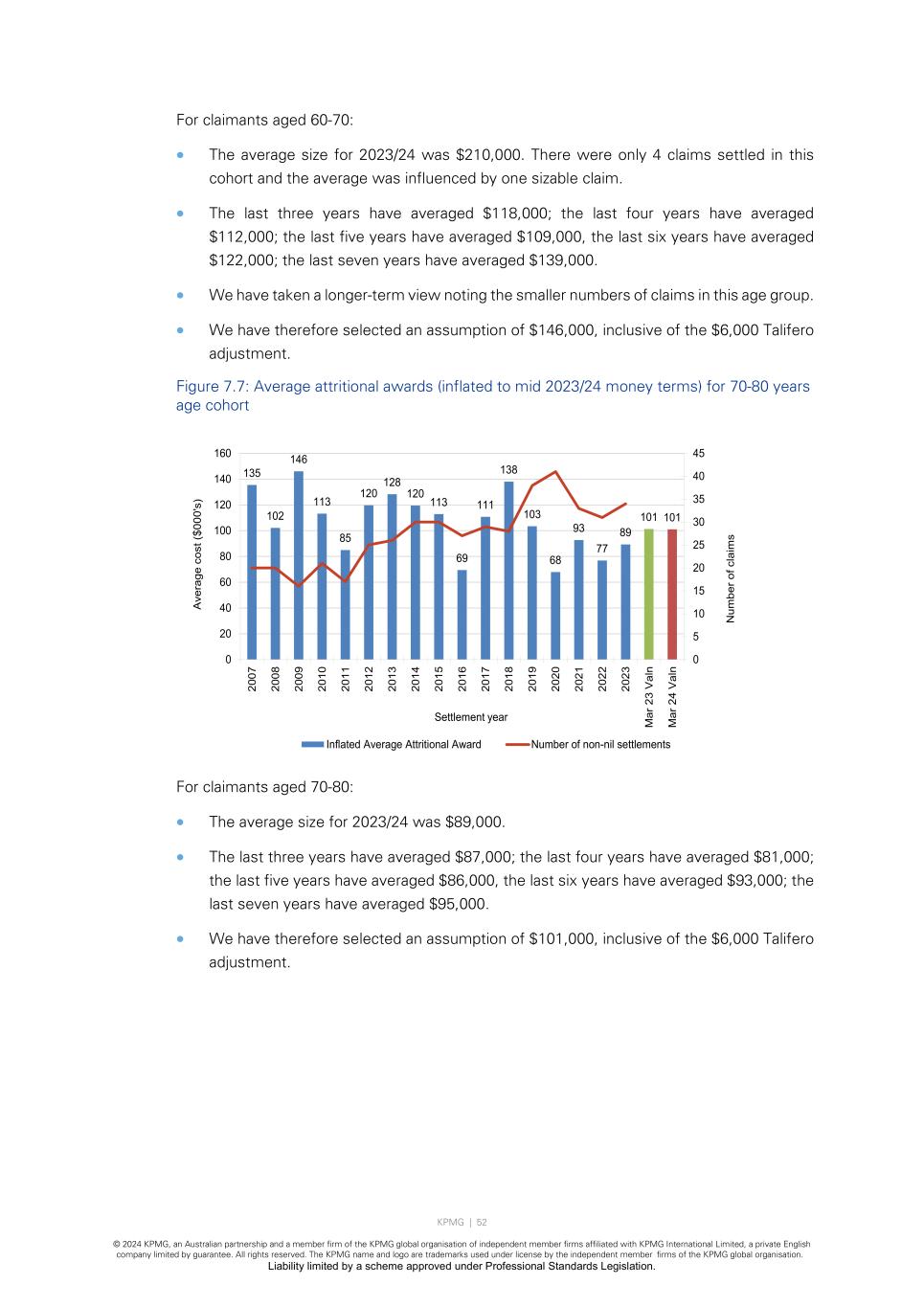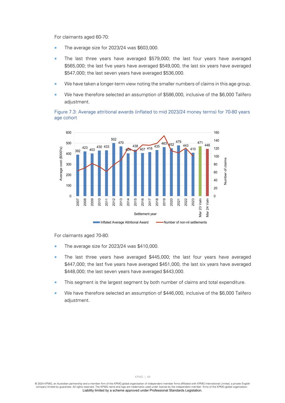 KPMG | 49 © 2024 KPMG, an Australian partnership and a member firm of the KPMG global organisation of independent member firms affiliated with KPMG International Limited, a private English company limited by guarantee. All rights reserved. The KPMG name and logo are trademarks used under license by the independent member firms of the KPMG global organisation. Liability limited by a scheme approved under Professional Standards Legislation. For claimants aged 60-70: • The average size for 2023/24 was $603,000. • The last three years have averaged $579,000; the last four years have averaged $565,000; the last five years have averaged $549,000, the last six years have averaged $547,000; the last seven years have averaged $536,000. • We have taken a longer-term view noting the smaller numbers of claims in this age group. • We have therefore selected an assumption of $586,000, inclusive of the $6,000 Talifero adjustment. Figure 7.3: Average attritional awards (inflated to mid 2023/24 money terms) for 70-80 years age cohort For claimants aged 70-80: • The average size for 2023/24 was $410,000. • The last three years have averaged $445,000; the last four years have averaged $447,000; the last five years have averaged $451,000, the last six years have averaged $448,000; the last seven years have averaged $443,000. • This segment is the largest segment by both number of claims and total expenditure. • We have therefore selected an assumption of $446,000, inclusive of the $6,000 Talifero adjustment. 392 423 403 430 433 502 470 404 438 407 416 435 463 452 479 443 410 471 446 0 20 40 60 80 100 120 140 160 0 100 200 300 400 500 600 20 07 20 08 20 09 20 10 20 11 20 12 20 13 20 14 20 15 20 16 20 17 20 18 20 19 20 20 20 21 20 22 20 23 M ar 2 3 V al n M ar 2 4 V al n N um be r o f c la im s A ve ra ge c os t ( $0 00 's ) Settlement year Inflated Average Attritional Award Number of non-nil settlements