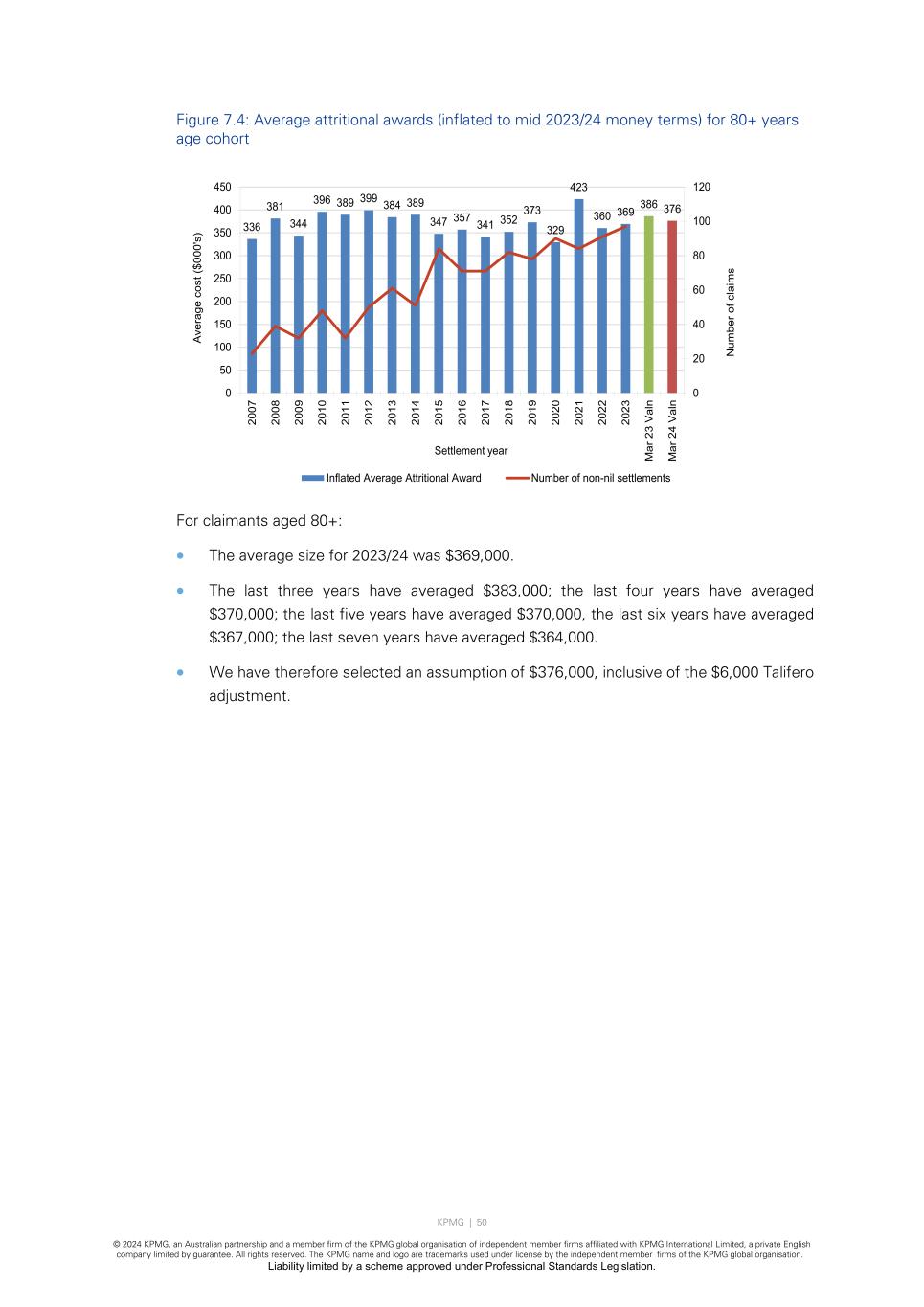 KPMG | 50 © 2024 KPMG, an Australian partnership and a member firm of the KPMG global organisation of independent member firms affiliated with KPMG International Limited, a private English company limited by guarantee. All rights reserved. The KPMG name and logo are trademarks used under license by the independent member firms of the KPMG global organisation. Liability limited by a scheme approved under Professional Standards Legislation. Figure 7.4: Average attritional awards (inflated to mid 2023/24 money terms) for 80+ years age cohort For claimants aged 80+: • The average size for 2023/24 was $369,000. • The last three years have averaged $383,000; the last four years have averaged $370,000; the last five years have averaged $370,000, the last six years have averaged $367,000; the last seven years have averaged $364,000. • We have therefore selected an assumption of $376,000, inclusive of the $6,000 Talifero adjustment. 336 381 344 396 389 399 384 389 347 357 341 352 373 329 423 360 369 386 376 0 20 40 60 80 100 120 0 50 100 150 200 250 300 350 400 450 20 07 20 08 20 09 20 10 20 11 20 12 20 13 20 14 20 15 20 16 20 17 20 18 20 19 20 20 20 21 20 22 20 23 M ar 2 3 V al n M ar 2 4 V al n N um be r o f c la im s A ve ra ge c os t ( $0 00 's ) Settlement year Inflated Average Attritional Award Number of non-nil settlements