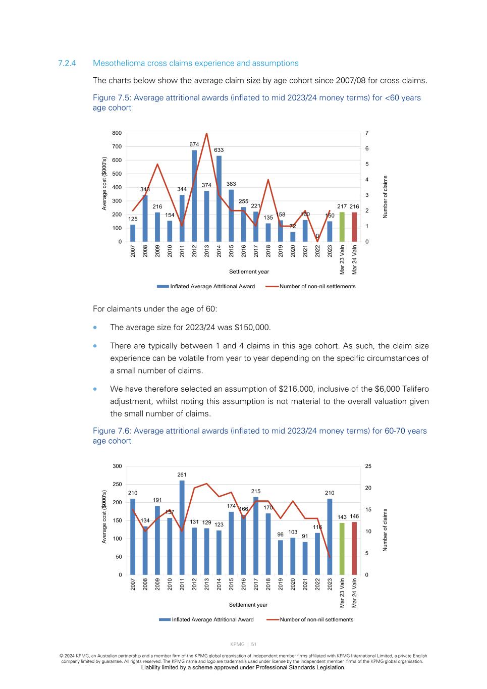 KPMG | 51 © 2024 KPMG, an Australian partnership and a member firm of the KPMG global organisation of independent member firms affiliated with KPMG International Limited, a private English company limited by guarantee. All rights reserved. The KPMG name and logo are trademarks used under license by the independent member firms of the KPMG global organisation. Liability limited by a scheme approved under Professional Standards Legislation. 7.2.4 Mesothelioma cross claims experience and assumptions The charts below show the average claim size by age cohort since 2007/08 for cross claims. Figure 7.5: Average attritional awards (inflated to mid 2023/24 money terms) for <60 years age cohort For claimants under the age of 60: • The average size for 2023/24 was $150,000. • There are typically between 1 and 4 claims in this age cohort. As such, the claim size experience can be volatile from year to year depending on the specific circumstances of a small number of claims. • We have therefore selected an assumption of $216,000, inclusive of the $6,000 Talifero adjustment, whilst noting this assumption is not material to the overall valuation given the small number of claims. Figure 7.6: Average attritional awards (inflated to mid 2023/24 money terms) for 60-70 years age cohort 125 343 216 154 344 674 374 633 383 255 221 135 158 72 160 0 150 217 216 0 1 2 3 4 5 6 7 0 100 200 300 400 500 600 700 800 20 07 20 08 20 09 20 10 20 11 20 12 20 13 20 14 20 15 20 16 20 17 20 18 20 19 20 20 20 21 20 22 20 23 M ar 2 3 Va ln M ar 2 4 Va ln N um be r o f c la im s Av er ag e co st ($ 00 0' s) Settlement year Inflated Average Attritional Award Number of non-nil settlements 210 134 191 157 261 131 129 123 174 166 215 170 96 103 91 116 210 143 146 0 5 10 15 20 25 0 50 100 150 200 250 300 20 07 20 08 20 09 20 10 20 11 20 12 20 13 20 14 20 15 20 16 20 17 20 18 20 19 20 20 20 21 20 22 20 23 M ar 2 3 Va ln M ar 2 4 Va ln N um be r o f c la im s Av er ag e co st ($ 00 0' s) Settlement year Inflated Average Attritional Award Number of non-nil settlements