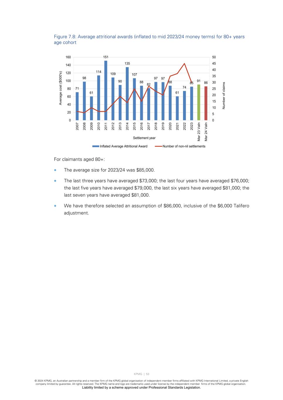 KPMG | 53 © 2024 KPMG, an Australian partnership and a member firm of the KPMG global organisation of independent member firms affiliated with KPMG International Limited, a private English company limited by guarantee. All rights reserved. The KPMG name and logo are trademarks used under license by the independent member firms of the KPMG global organisation. Liability limited by a scheme approved under Professional Standards Legislation. Figure 7.8: Average attritional awards (inflated to mid 2023/24 money terms) for 80+ years age cohort For claimants aged 80+: • The average size for 2023/24 was $85,000. • The last three years have averaged $73,000; the last four years have averaged $76,000; the last five years have averaged $79,000, the last six years have averaged $81,000; the last seven years have averaged $81,000. • We have therefore selected an assumption of $86,000, inclusive of the $6,000 Talifero adjustment. 71 98 61 114 151 109 90 135 107 88 82 97 97 88 61 74 85 91 86 0 5 10 15 20 25 30 35 40 45 50 0 20 40 60 80 100 120 140 160 20 07 20 08 20 09 20 10 20 11 20 12 20 13 20 14 20 15 20 16 20 17 20 18 20 19 20 20 20 21 20 22 20 23 M ar 2 3 V al n M ar 2 4 V al n N um be r o f c la im s A ve ra ge c os t ( $0 00 's ) Settlement year Inflated Average Attritional Award Number of non-nil settlements