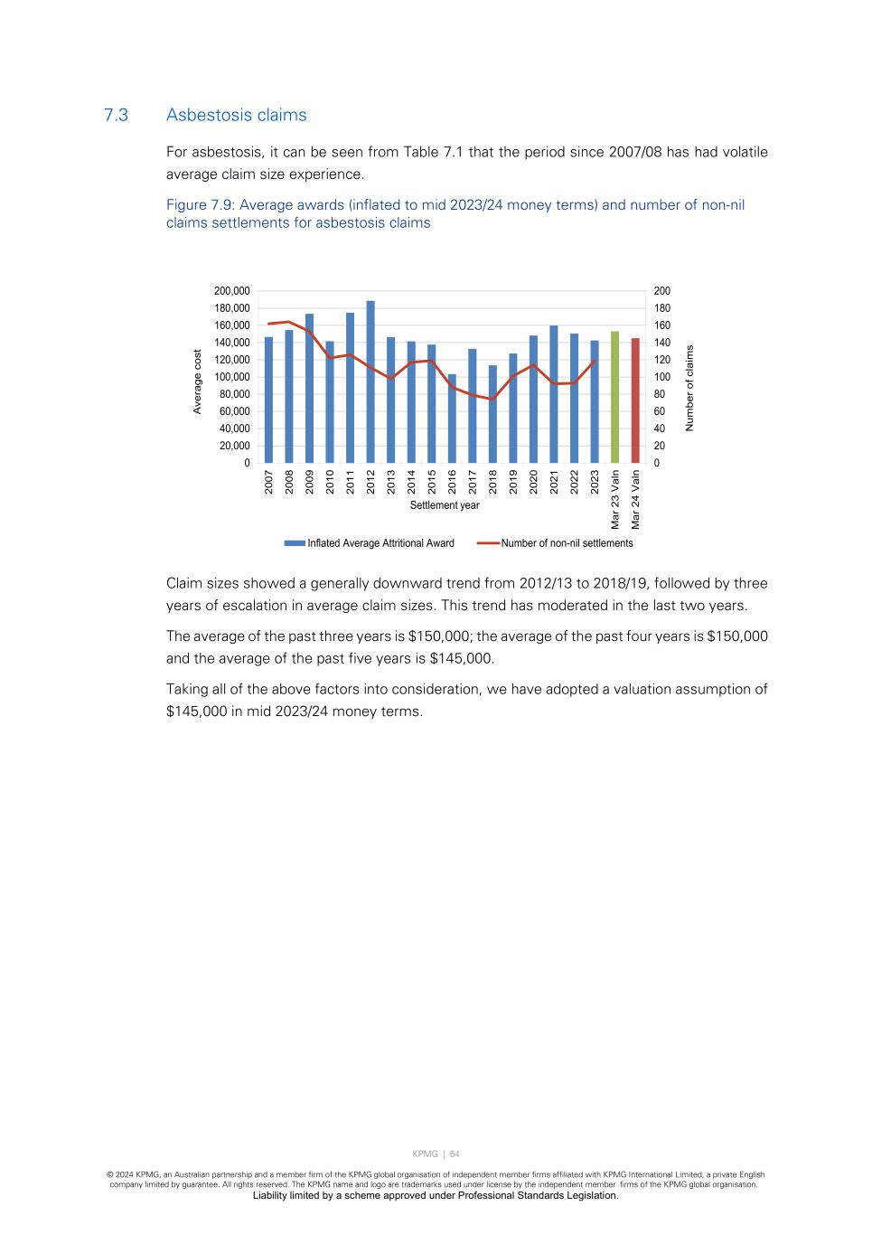 KPMG | 54 © 2024 KPMG, an Australian partnership and a member firm of the KPMG global organisation of independent member firms affiliated with KPMG International Limited, a private English company limited by guarantee. All rights reserved. The KPMG name and logo are trademarks used under license by the independent member firms of the KPMG global organisation. Liability limited by a scheme approved under Professional Standards Legislation. 7.3 Asbestosis claims For asbestosis, it can be seen from Table 7.1 that the period since 2007/08 has had volatile average claim size experience. Figure 7.9: Average awards (inflated to mid 2023/24 money terms) and number of non-nil claims settlements for asbestosis claims Claim sizes showed a generally downward trend from 2012/13 to 2018/19, followed by three years of escalation in average claim sizes. This trend has moderated in the last two years. The average of the past three years is $150,000; the average of the past four years is $150,000 and the average of the past five years is $145,000. Taking all of the above factors into consideration, we have adopted a valuation assumption of $145,000 in mid 2023/24 money terms. 0 20 40 60 80 100 120 140 160 180 200 0 20,000 40,000 60,000 80,000 100,000 120,000 140,000 160,000 180,000 200,000 20 07 20 08 20 09 20 10 20 11 20 12 20 13 20 14 20 15 20 16 20 17 20 18 20 19 20 20 20 21 20 22 20 23 M ar 2 3 V al n M ar 2 4 V al n N um be r o f c la im s A ve ra ge c os t Settlement year Inflated Average Attritional Award Number of non-nil settlements