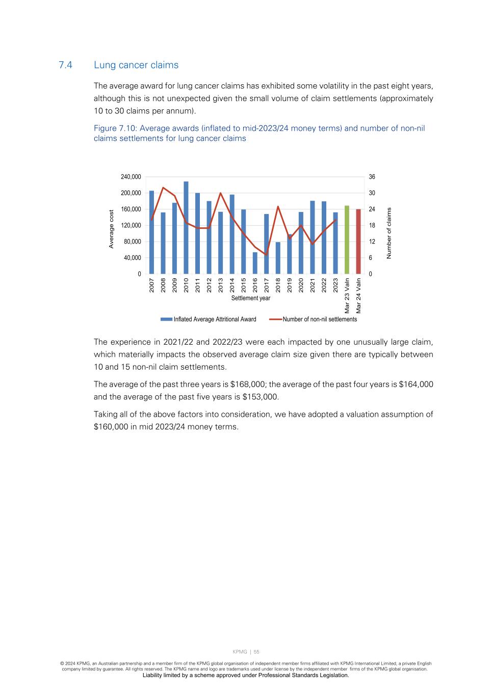 KPMG | 55 © 2024 KPMG, an Australian partnership and a member firm of the KPMG global organisation of independent member firms affiliated with KPMG International Limited, a private English company limited by guarantee. All rights reserved. The KPMG name and logo are trademarks used under license by the independent member firms of the KPMG global organisation. Liability limited by a scheme approved under Professional Standards Legislation. 7.4 Lung cancer claims The average award for lung cancer claims has exhibited some volatility in the past eight years, although this is not unexpected given the small volume of claim settlements (approximately 10 to 30 claims per annum). Figure 7.10: Average awards (inflated to mid-2023/24 money terms) and number of non-nil claims settlements for lung cancer claims The experience in 2021/22 and 2022/23 were each impacted by one unusually large claim, which materially impacts the observed average claim size given there are typically between 10 and 15 non-nil claim settlements. The average of the past three years is $168,000; the average of the past four years is $164,000 and the average of the past five years is $153,000. Taking all of the above factors into consideration, we have adopted a valuation assumption of $160,000 in mid 2023/24 money terms. 0 6 12 18 24 30 36 0 40,000 80,000 120,000 160,000 200,000 240,000 20 07 20 08 20 09 20 10 20 11 20 12 20 13 20 14 20 15 20 16 20 17 20 18 20 19 20 20 20 21 20 22 20 23 M ar 2 3 V al n M ar 2 4 V al n N um be r of c la im s A ve ra ge c os t Settlement year Inflated Average Attritional Award Number of non-nil settlements