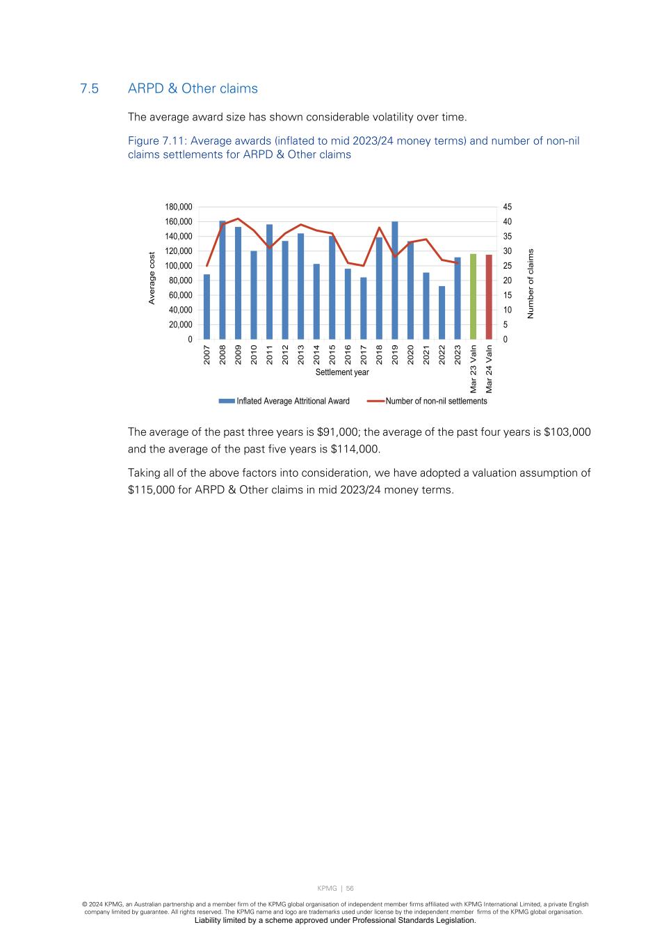 KPMG | 56 © 2024 KPMG, an Australian partnership and a member firm of the KPMG global organisation of independent member firms affiliated with KPMG International Limited, a private English company limited by guarantee. All rights reserved. The KPMG name and logo are trademarks used under license by the independent member firms of the KPMG global organisation. Liability limited by a scheme approved under Professional Standards Legislation. 7.5 ARPD & Other claims The average award size has shown considerable volatility over time. Figure 7.11: Average awards (inflated to mid 2023/24 money terms) and number of non-nil claims settlements for ARPD & Other claims The average of the past three years is $91,000; the average of the past four years is $103,000 and the average of the past five years is $114,000. Taking all of the above factors into consideration, we have adopted a valuation assumption of $115,000 for ARPD & Other claims in mid 2023/24 money terms. 0 5 10 15 20 25 30 35 40 45 0 20,000 40,000 60,000 80,000 100,000 120,000 140,000 160,000 180,000 20 07 20 08 20 09 20 10 20 11 20 12 20 13 20 14 20 15 20 16 20 17 20 18 20 19 20 20 20 21 20 22 20 23 M ar 2 3 V al n M ar 2 4 V al n N um be r of c la im s A ve ra ge c os t Settlement year Inflated Average Attritional Award Number of non-nil settlements