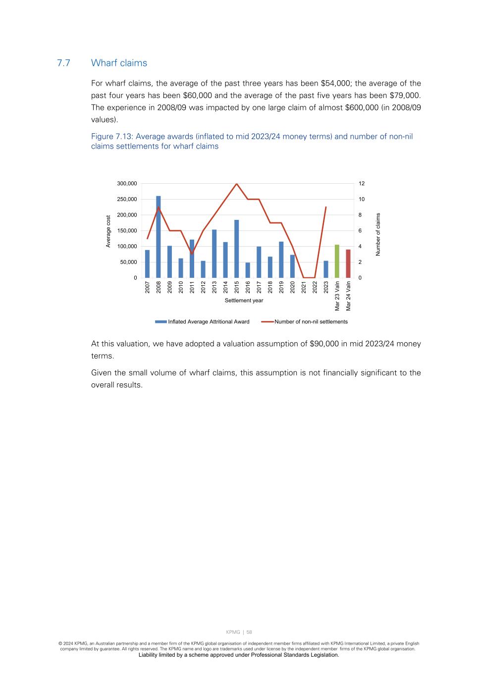 KPMG | 58 © 2024 KPMG, an Australian partnership and a member firm of the KPMG global organisation of independent member firms affiliated with KPMG International Limited, a private English company limited by guarantee. All rights reserved. The KPMG name and logo are trademarks used under license by the independent member firms of the KPMG global organisation. Liability limited by a scheme approved under Professional Standards Legislation. 7.7 Wharf claims For wharf claims, the average of the past three years has been $54,000; the average of the past four years has been $60,000 and the average of the past five years has been $79,000. The experience in 2008/09 was impacted by one large claim of almost $600,000 (in 2008/09 values). Figure 7.13: Average awards (inflated to mid 2023/24 money terms) and number of non-nil claims settlements for wharf claims At this valuation, we have adopted a valuation assumption of $90,000 in mid 2023/24 money terms. Given the small volume of wharf claims, this assumption is not financially significant to the overall results. 0 2 4 6 8 10 12 0 50,000 100,000 150,000 200,000 250,000 300,000 20 07 20 08 20 09 20 10 20 11 20 12 20 13 20 14 20 15 20 16 20 17 20 18 20 19 20 20 20 21 20 22 20 23 M ar 2 3 Va ln M ar 2 4 Va ln N um be r o f c la im s Av er ag e co st Settlement year Inflated Average Attritional Award Number of non-nil settlements