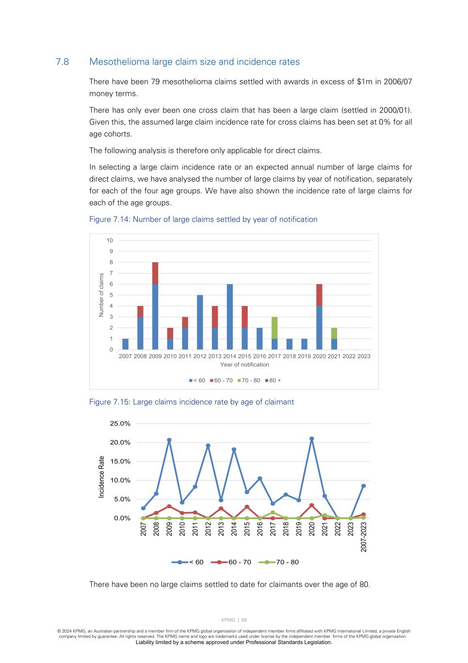 KPMG | 59 © 2024 KPMG, an Australian partnership and a member firm of the KPMG global organisation of independent member firms affiliated with KPMG International Limited, a private English company limited by guarantee. All rights reserved. The KPMG name and logo are trademarks used under license by the independent member firms of the KPMG global organisation. Liability limited by a scheme approved under Professional Standards Legislation. 7.8 Mesothelioma large claim size and incidence rates There have been 79 mesothelioma claims settled with awards in excess of $1m in 2006/07 money terms. There has only ever been one cross claim that has been a large claim (settled in 2000/01). Given this, the assumed large claim incidence rate for cross claims has been set at 0% for all age cohorts. The following analysis is therefore only applicable for direct claims. In selecting a large claim incidence rate or an expected annual number of large claims for direct claims, we have analysed the number of large claims by year of notification, separately for each of the four age groups. We have also shown the incidence rate of large claims for each of the age groups. Figure 7.14: Number of large claims settled by year of notification Figure 7.15: Large claims incidence rate by age of claimant There have been no large claims settled to date for claimants over the age of 80. 0 1 2 3 4 5 6 7 8 9 10 2007 2008 2009 2010 2011 2012 2013 2014 2015 2016 2017 2018 2019 2020 2021 2022 2023 N um be r o f c la im s Year of notification < 60 60 - 70 70 - 80 80 + 0.0% 5.0% 10.0% 15.0% 20.0% 25.0% 20 07 20 08 20 09 20 10 20 11 20 12 20 13 20 14 20 15 20 16 20 17 20 18 20 19 20 20 20 21 20 22 20 23 20 07 -2 02 3 In cid en ce R at e < 60 60 - 70 70 - 80