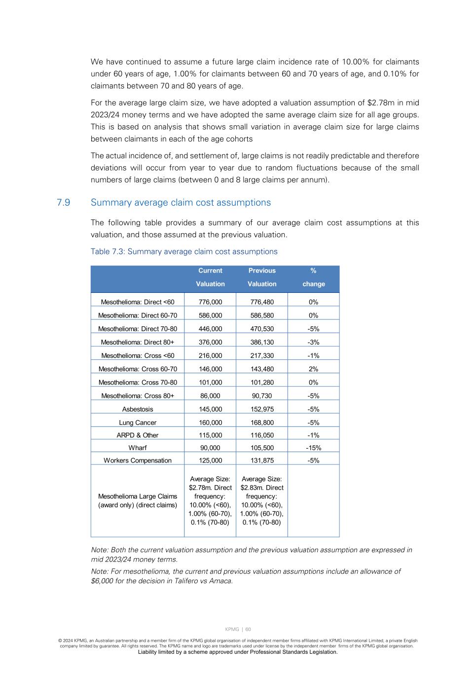 KPMG | 60 © 2024 KPMG, an Australian partnership and a member firm of the KPMG global organisation of independent member firms affiliated with KPMG International Limited, a private English company limited by guarantee. All rights reserved. The KPMG name and logo are trademarks used under license by the independent member firms of the KPMG global organisation. Liability limited by a scheme approved under Professional Standards Legislation. We have continued to assume a future large claim incidence rate of 10.00% for claimants under 60 years of age, 1.00% for claimants between 60 and 70 years of age, and 0.10% for claimants between 70 and 80 years of age. For the average large claim size, we have adopted a valuation assumption of $2.78m in mid 2023/24 money terms and we have adopted the same average claim size for all age groups. This is based on analysis that shows small variation in average claim size for large claims between claimants in each of the age cohorts The actual incidence of, and settlement of, large claims is not readily predictable and therefore deviations will occur from year to year due to random fluctuations because of the small numbers of large claims (between 0 and 8 large claims per annum). 7.9 Summary average claim cost assumptions The following table provides a summary of our average claim cost assumptions at this valuation, and those assumed at the previous valuation. Table 7.3: Summary average claim cost assumptions Note: Both the current valuation assumption and the previous valuation assumption are expressed in mid 2023/24 money terms. Note: For mesothelioma, the current and previous valuation assumptions include an allowance of $6,000 for the decision in Talifero vs Amaca. Current Previous % Valuation Valuation change Mesothelioma: Direct <60 776,000 776,480 0% Mesothelioma: Direct 60-70 586,000 586,580 0% Mesothelioma: Direct 70-80 446,000 470,530 -5% Mesothelioma: Direct 80+ 376,000 386,130 -3% Mesothelioma: Cross <60 216,000 217,330 -1% Mesothelioma: Cross 60-70 146,000 143,480 2% Mesothelioma: Cross 70-80 101,000 101,280 0% Mesothelioma: Cross 80+ 86,000 90,730 -5% Asbestosis 145,000 152,975 -5% Lung Cancer 160,000 168,800 -5% ARPD & Other 115,000 116,050 -1% Wharf 90,000 105,500 -15% Workers Compensation 125,000 131,875 -5% Mesothelioma Large Claims (award only) (direct claims) Average Size: $2.78m. Direct frequency: 10.00% (<60), 1.00% (60-70), 0.1% (70-80) Average Size: $2.83m. Direct frequency: 10.00% (<60), 1.00% (60-70), 0.1% (70-80)