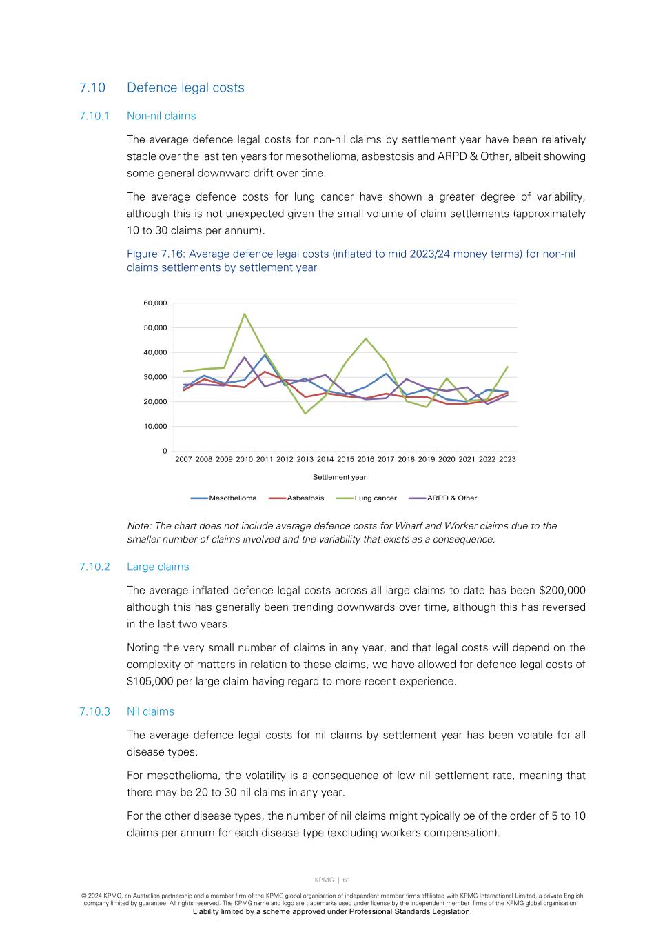 KPMG | 61 © 2024 KPMG, an Australian partnership and a member firm of the KPMG global organisation of independent member firms affiliated with KPMG International Limited, a private English company limited by guarantee. All rights reserved. The KPMG name and logo are trademarks used under license by the independent member firms of the KPMG global organisation. Liability limited by a scheme approved under Professional Standards Legislation. 7.10 Defence legal costs 7.10.1 Non-nil claims The average defence legal costs for non-nil claims by settlement year have been relatively stable over the last ten years for mesothelioma, asbestosis and ARPD & Other, albeit showing some general downward drift over time. The average defence costs for lung cancer have shown a greater degree of variability, although this is not unexpected given the small volume of claim settlements (approximately 10 to 30 claims per annum). Figure 7.16: Average defence legal costs (inflated to mid 2023/24 money terms) for non-nil claims settlements by settlement year Note: The chart does not include average defence costs for Wharf and Worker claims due to the smaller number of claims involved and the variability that exists as a consequence. 7.10.2 Large claims The average inflated defence legal costs across all large claims to date has been $200,000 although this has generally been trending downwards over time, although this has reversed in the last two years. Noting the very small number of claims in any year, and that legal costs will depend on the complexity of matters in relation to these claims, we have allowed for defence legal costs of $105,000 per large claim having regard to more recent experience. 7.10.3 Nil claims The average defence legal costs for nil claims by settlement year has been volatile for all disease types. For mesothelioma, the volatility is a consequence of low nil settlement rate, meaning that there may be 20 to 30 nil claims in any year. For the other disease types, the number of nil claims might typically be of the order of 5 to 10 claims per annum for each disease type (excluding workers compensation). 0 10,000 20,000 30,000 40,000 50,000 60,000 2007 2008 2009 2010 2011 2012 2013 2014 2015 2016 2017 2018 2019 2020 2021 2022 2023 Settlement year Mesothelioma Asbestosis Lung cancer ARPD & Other