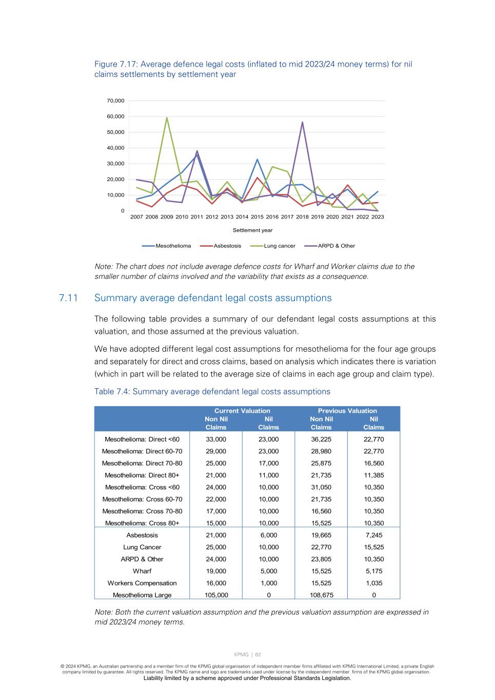 KPMG | 62 © 2024 KPMG, an Australian partnership and a member firm of the KPMG global organisation of independent member firms affiliated with KPMG International Limited, a private English company limited by guarantee. All rights reserved. The KPMG name and logo are trademarks used under license by the independent member firms of the KPMG global organisation. Liability limited by a scheme approved under Professional Standards Legislation. Figure 7.17: Average defence legal costs (inflated to mid 2023/24 money terms) for nil claims settlements by settlement year Note: The chart does not include average defence costs for Wharf and Worker claims due to the smaller number of claims involved and the variability that exists as a consequence. 7.11 Summary average defendant legal costs assumptions The following table provides a summary of our defendant legal costs assumptions at this valuation, and those assumed at the previous valuation. We have adopted different legal cost assumptions for mesothelioma for the four age groups and separately for direct and cross claims, based on analysis which indicates there is variation (which in part will be related to the average size of claims in each age group and claim type). Table 7.4: Summary average defendant legal costs assumptions Note: Both the current valuation assumption and the previous valuation assumption are expressed in mid 2023/24 money terms. 0 10,000 20,000 30,000 40,000 50,000 60,000 70,000 2007 2008 2009 2010 2011 2012 2013 2014 2015 2016 2017 2018 2019 2020 2021 2022 2023 Settlement year Mesothelioma Asbestosis Lung cancer ARPD & Other Current Valuation Previous Valuation Non Nil Nil Non Nil Nil Claims Claims Claims Claims Mesothelioma: Direct <60 33,000 23,000 36,225 22,770 Mesothelioma: Direct 60-70 29,000 23,000 28,980 22,770 Mesothelioma: Direct 70-80 25,000 17,000 25,875 16,560 Mesothelioma: Direct 80+ 21,000 11,000 21,735 11,385 Mesothelioma: Cross <60 24,000 10,000 31,050 10,350 Mesothelioma: Cross 60-70 22,000 10,000 21,735 10,350 Mesothelioma: Cross 70-80 17,000 10,000 16,560 10,350 Mesothelioma: Cross 80+ 15,000 10,000 15,525 10,350 Asbestosis 21,000 6,000 19,665 7,245 Lung Cancer 25,000 10,000 22,770 15,525 ARPD & Other 24,000 10,000 23,805 10,350 Wharf 19,000 5,000 15,525 5,175 Workers Compensation 16,000 1,000 15,525 1,035 Mesothelioma Large 105,000 0 108,675 0