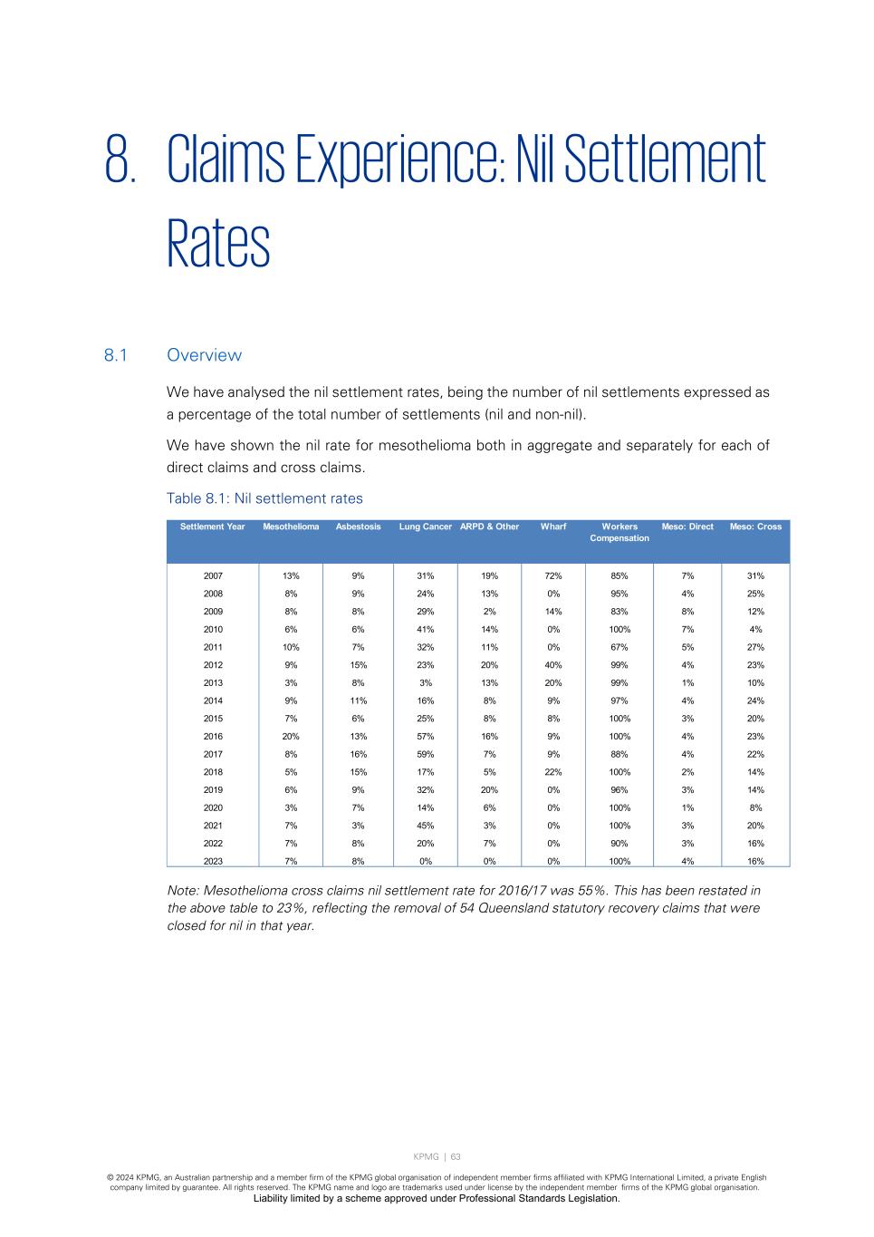 KPMG | 63 © 2024 KPMG, an Australian partnership and a member firm of the KPMG global organisation of independent member firms affiliated with KPMG International Limited, a private English company limited by guarantee. All rights reserved. The KPMG name and logo are trademarks used under license by the independent member firms of the KPMG global organisation. Liability limited by a scheme approved under Professional Standards Legislation. 8. Claims Experience: Nil Settlement Rates 8.1 Overview We have analysed the nil settlement rates, being the number of nil settlements expressed as a percentage of the total number of settlements (nil and non-nil). We have shown the nil rate for mesothelioma both in aggregate and separately for each of direct claims and cross claims. Table 8.1: Nil settlement rates Note: Mesothelioma cross claims nil settlement rate for 2016/17 was 55%. This has been restated in the above table to 23%, reflecting the removal of 54 Queensland statutory recovery claims that were closed for nil in that year. Settlement Year Mesothelioma Asbestosis Lung Cancer ARPD & Other Wharf Workers Compensation Meso: Direct Meso: Cross 2007 13% 9% 31% 19% 72% 85% 7% 31% 2008 8% 9% 24% 13% 0% 95% 4% 25% 2009 8% 8% 29% 2% 14% 83% 8% 12% 2010 6% 6% 41% 14% 0% 100% 7% 4% 2011 10% 7% 32% 11% 0% 67% 5% 27% 2012 9% 15% 23% 20% 40% 99% 4% 23% 2013 3% 8% 3% 13% 20% 99% 1% 10% 2014 9% 11% 16% 8% 9% 97% 4% 24% 2015 7% 6% 25% 8% 8% 100% 3% 20% 2016 20% 13% 57% 16% 9% 100% 4% 23% 2017 8% 16% 59% 7% 9% 88% 4% 22% 2018 5% 15% 17% 5% 22% 100% 2% 14% 2019 6% 9% 32% 20% 0% 96% 3% 14% 2020 3% 7% 14% 6% 0% 100% 1% 8% 2021 7% 3% 45% 3% 0% 100% 3% 20% 2022 7% 8% 20% 7% 0% 90% 3% 16% 2023 7% 8% 0% 0% 0% 100% 4% 16%