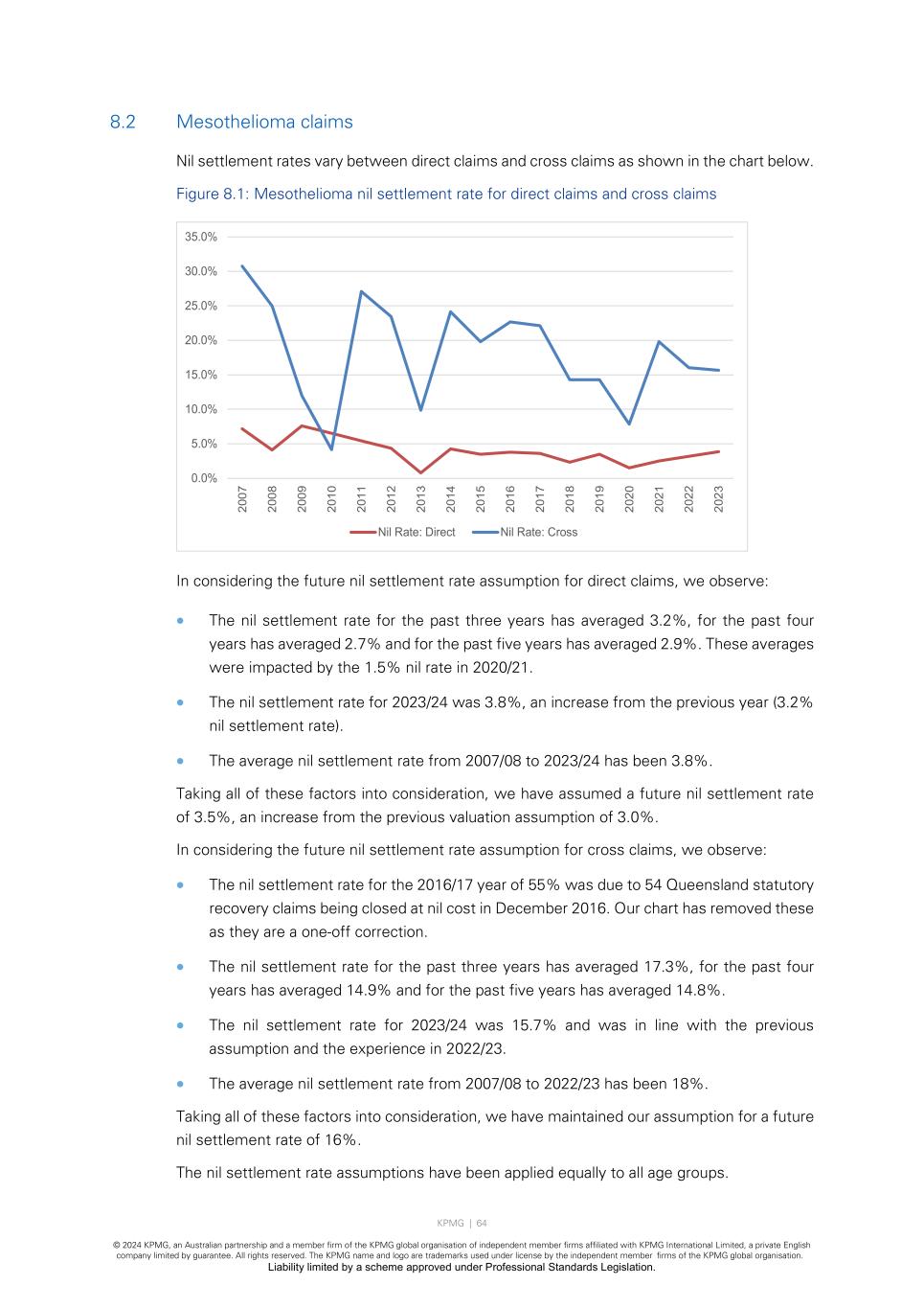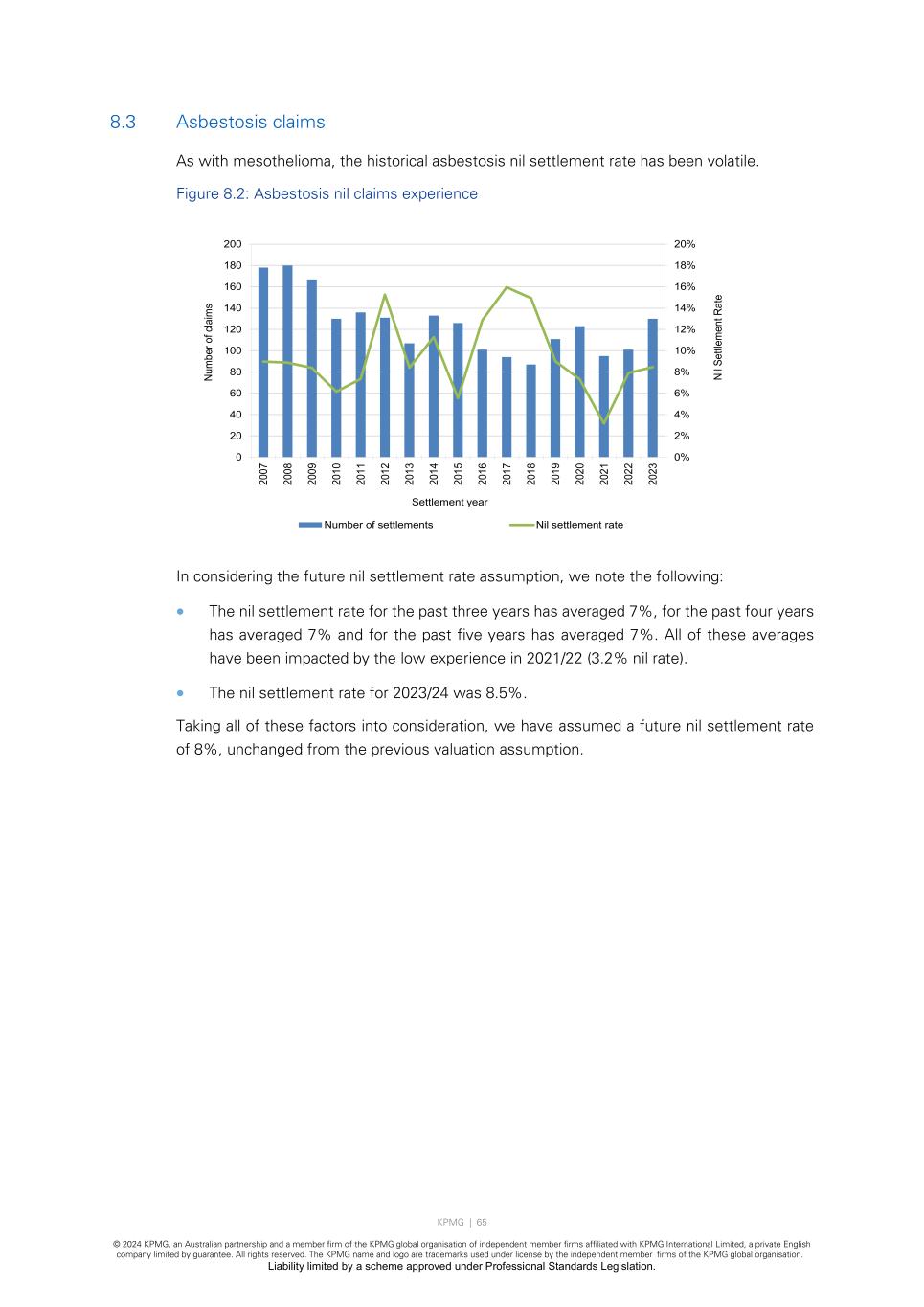KPMG | 64 © 2024 KPMG, an Australian partnership and a member firm of the KPMG global organisation of independent member firms affiliated with KPMG International Limited, a private English company limited by guarantee. All rights reserved. The KPMG name and logo are trademarks used under license by the independent member firms of the KPMG global organisation. Liability limited by a scheme approved under Professional Standards Legislation. 8.2 Mesothelioma claims Nil settlement rates vary between direct claims and cross claims as shown in the chart below. Figure 8.1: Mesothelioma nil settlement rate for direct claims and cross claims In considering the future nil settlement rate assumption for direct claims, we observe: • The nil settlement rate for the past three years has averaged 3.2%, for the past four years has averaged 2.7% and for the past five years has averaged 2.9%. These averages were impacted by the 1.5% nil rate in 2020/21. • The nil settlement rate for 2023/24 was 3.8%, an increase from the previous year (3.2% nil settlement rate). • The average nil settlement rate from 2007/08 to 2023/24 has been 3.8%. Taking all of these factors into consideration, we have assumed a future nil settlement rate of 3.5%, an increase from the previous valuation assumption of 3.0%. In considering the future nil settlement rate assumption for cross claims, we observe: • The nil settlement rate for the 2016/17 year of 55% was due to 54 Queensland statutory recovery claims being closed at nil cost in December 2016. Our chart has removed these as they are a one-off correction. • The nil settlement rate for the past three years has averaged 17.3%, for the past four years has averaged 14.9% and for the past five years has averaged 14.8%. • The nil settlement rate for 2023/24 was 15.7% and was in line with the previous assumption and the experience in 2022/23. • The average nil settlement rate from 2007/08 to 2022/23 has been 18%. Taking all of these factors into consideration, we have maintained our assumption for a future nil settlement rate of 16%. The nil settlement rate assumptions have been applied equally to all age groups. 0.0% 5.0% 10.0% 15.0% 20.0% 25.0% 30.0% 35.0% 20 07 20 08 20 09 20 10 20 11 20 12 20 13 20 14 20 15 20 16 20 17 20 18 20 19 20 20 20 21 20 22 20 23 Nil Rate: Direct Nil Rate: Cross