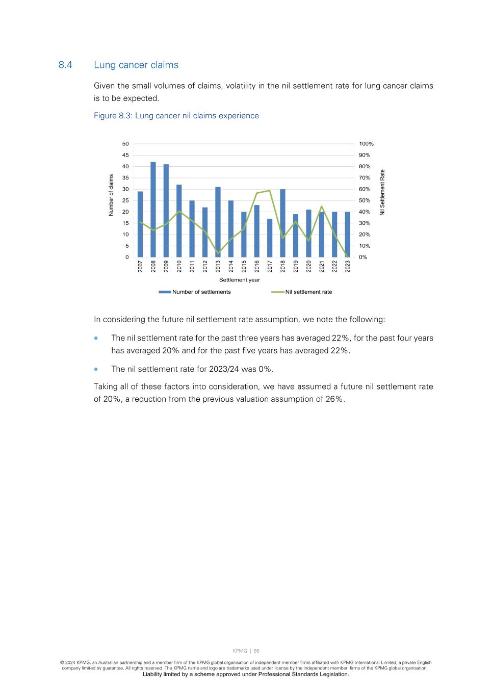 KPMG | 65 © 2024 KPMG, an Australian partnership and a member firm of the KPMG global organisation of independent member firms affiliated with KPMG International Limited, a private English company limited by guarantee. All rights reserved. The KPMG name and logo are trademarks used under license by the independent member firms of the KPMG global organisation. Liability limited by a scheme approved under Professional Standards Legislation. 8.3 Asbestosis claims As with mesothelioma, the historical asbestosis nil settlement rate has been volatile. Figure 8.2: Asbestosis nil claims experience In considering the future nil settlement rate assumption, we note the following: • The nil settlement rate for the past three years has averaged 7%, for the past four years has averaged 7% and for the past five years has averaged 7%. All of these averages have been impacted by the low experience in 2021/22 (3.2% nil rate). • The nil settlement rate for 2023/24 was 8.5%. Taking all of these factors into consideration, we have assumed a future nil settlement rate of 8%, unchanged from the previous valuation assumption. 0% 2% 4% 6% 8% 10% 12% 14% 16% 18% 20% 0 20 40 60 80 100 120 140 160 180 200 20 07 20 08 20 09 20 10 20 11 20 12 20 13 20 14 20 15 20 16 20 17 20 18 20 19 20 20 20 21 20 22 20 23 Ni l S et tle m en t R at e Nu m be r o f c la im s Settlement year Number of settlements Nil settlement rate