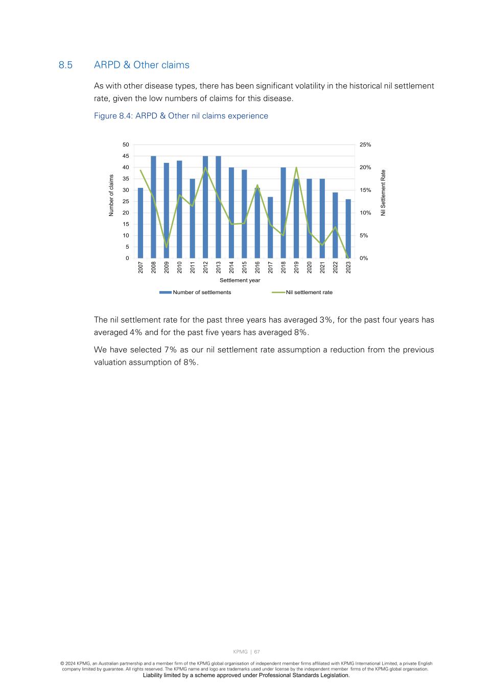 KPMG | 67 © 2024 KPMG, an Australian partnership and a member firm of the KPMG global organisation of independent member firms affiliated with KPMG International Limited, a private English company limited by guarantee. All rights reserved. The KPMG name and logo are trademarks used under license by the independent member firms of the KPMG global organisation. Liability limited by a scheme approved under Professional Standards Legislation. 8.5 ARPD & Other claims As with other disease types, there has been significant volatility in the historical nil settlement rate, given the low numbers of claims for this disease. Figure 8.4: ARPD & Other nil claims experience The nil settlement rate for the past three years has averaged 3%, for the past four years has averaged 4% and for the past five years has averaged 8%. We have selected 7% as our nil settlement rate assumption a reduction from the previous valuation assumption of 8%. 0% 5% 10% 15% 20% 25% 0 5 10 15 20 25 30 35 40 45 50 20 07 20 08 20 09 20 10 20 11 20 12 20 13 20 14 20 15 20 16 20 17 20 18 20 19 20 20 20 21 20 22 20 23 Ni l S et tle m en t R at e Nu m be r o f c la im s Settlement year Number of settlements Nil settlement rate