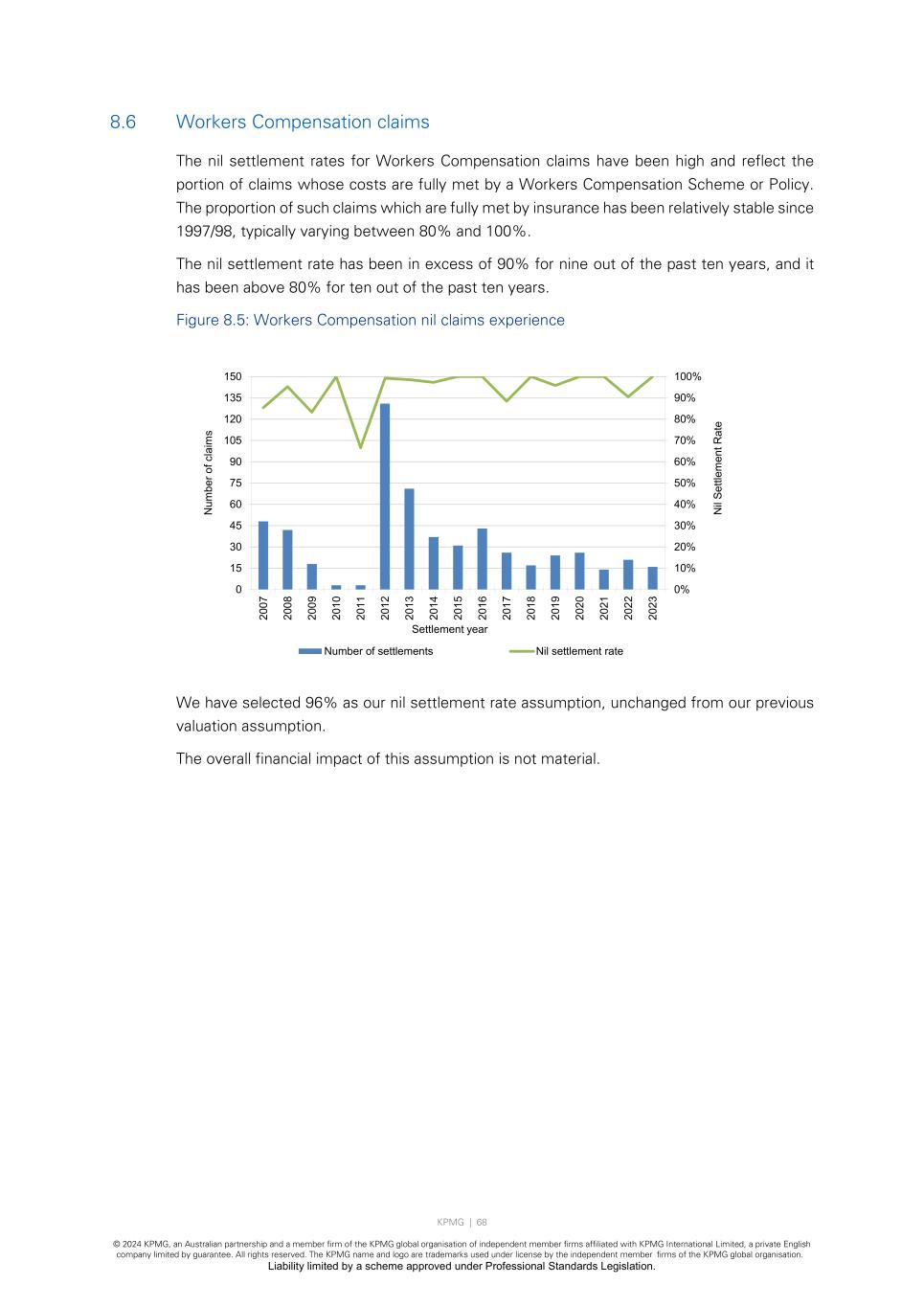 KPMG | 68 © 2024 KPMG, an Australian partnership and a member firm of the KPMG global organisation of independent member firms affiliated with KPMG International Limited, a private English company limited by guarantee. All rights reserved. The KPMG name and logo are trademarks used under license by the independent member firms of the KPMG global organisation. Liability limited by a scheme approved under Professional Standards Legislation. 8.6 Workers Compensation claims The nil settlement rates for Workers Compensation claims have been high and reflect the portion of claims whose costs are fully met by a Workers Compensation Scheme or Policy. The proportion of such claims which are fully met by insurance has been relatively stable since 1997/98, typically varying between 80% and 100%. The nil settlement rate has been in excess of 90% for nine out of the past ten years, and it has been above 80% for ten out of the past ten years. Figure 8.5: Workers Compensation nil claims experience We have selected 96% as our nil settlement rate assumption, unchanged from our previous valuation assumption. The overall financial impact of this assumption is not material. 0% 10% 20% 30% 40% 50% 60% 70% 80% 90% 100% 0 15 30 45 60 75 90 105 120 135 150 20 07 20 08 20 09 20 10 20 11 20 12 20 13 20 14 20 15 20 16 20 17 20 18 20 19 20 20 20 21 20 22 20 23 N il Se ttl em en t R at e N um be r o f c la im s Settlement year Number of settlements Nil settlement rate