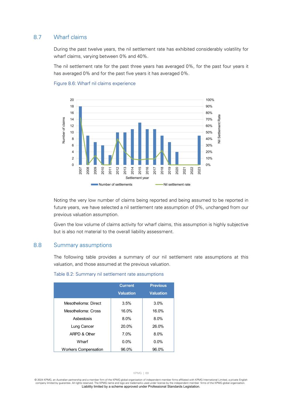 KPMG | 69 © 2024 KPMG, an Australian partnership and a member firm of the KPMG global organisation of independent member firms affiliated with KPMG International Limited, a private English company limited by guarantee. All rights reserved. The KPMG name and logo are trademarks used under license by the independent member firms of the KPMG global organisation. Liability limited by a scheme approved under Professional Standards Legislation. 8.7 Wharf claims During the past twelve years, the nil settlement rate has exhibited considerably volatility for wharf claims, varying between 0% and 40%. The nil settlement rate for the past three years has averaged 0%, for the past four years it has averaged 0% and for the past five years it has averaged 0%. Figure 8.6: Wharf nil claims experience Noting the very low number of claims being reported and being assumed to be reported in future years, we have selected a nil settlement rate assumption of 0%, unchanged from our previous valuation assumption. Given the low volume of claims activity for wharf claims, this assumption is highly subjective but is also not material to the overall liability assessment. 8.8 Summary assumptions The following table provides a summary of our nil settlement rate assumptions at this valuation, and those assumed at the previous valuation. Table 8.2: Summary nil settlement rate assumptions 0% 10% 20% 30% 40% 50% 60% 70% 80% 90% 100% 0 2 4 6 8 10 12 14 16 18 20 20 07 20 08 20 09 20 10 20 11 20 12 20 13 20 14 20 15 20 16 20 17 20 18 20 19 20 20 20 21 20 22 20 23 N il Se ttl em en t R at e N um be r o f c la im s Settlement year Number of settlements Nil settlement rate Current Previous Valuation Valuation Mesothelioma: Direct 3.5% 3.0% Mesothelioma: Cross 16.0% 16.0% Asbestosis 8.0% 8.0% Lung Cancer 20.0% 26.0% ARPD & Other 7.0% 8.0% Wharf 0.0% 0.0% Workers Compensation 96.0% 96.0%