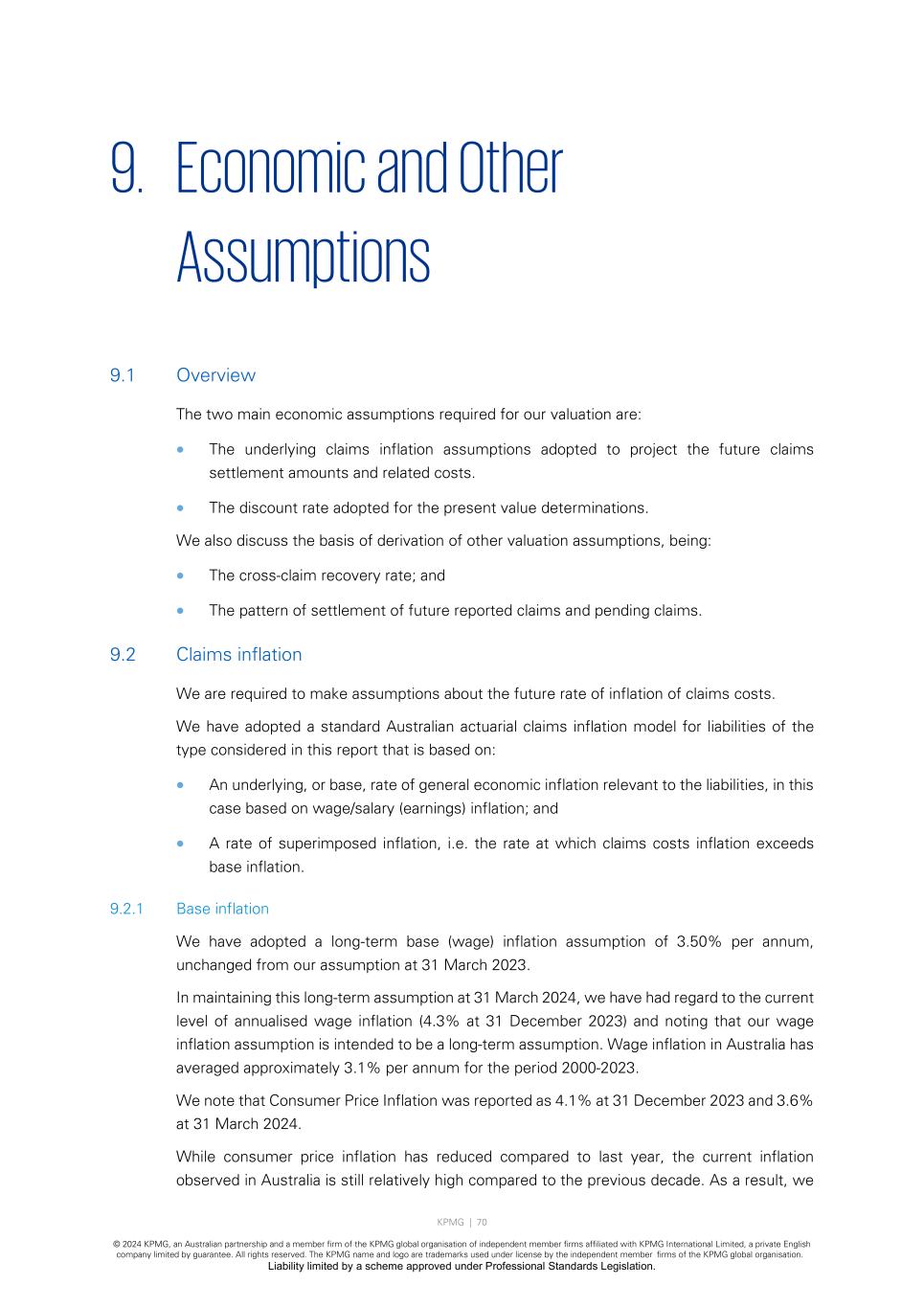 KPMG | 70 © 2024 KPMG, an Australian partnership and a member firm of the KPMG global organisation of independent member firms affiliated with KPMG International Limited, a private English company limited by guarantee. All rights reserved. The KPMG name and logo are trademarks used under license by the independent member firms of the KPMG global organisation. Liability limited by a scheme approved under Professional Standards Legislation. 9. Economic and Other Assumptions 9.1 Overview The two main economic assumptions required for our valuation are: • The underlying claims inflation assumptions adopted to project the future claims settlement amounts and related costs. • The discount rate adopted for the present value determinations. We also discuss the basis of derivation of other valuation assumptions, being: • The cross-claim recovery rate; and • The pattern of settlement of future reported claims and pending claims. 9.2 Claims inflation We are required to make assumptions about the future rate of inflation of claims costs. We have adopted a standard Australian actuarial claims inflation model for liabilities of the type considered in this report that is based on: • An underlying, or base, rate of general economic inflation relevant to the liabilities, in this case based on wage/salary (earnings) inflation; and • A rate of superimposed inflation, i.e. the rate at which claims costs inflation exceeds base inflation. 9.2.1 Base inflation We have adopted a long-term base (wage) inflation assumption of 3.50% per annum, unchanged from our assumption at 31 March 2023. In maintaining this long-term assumption at 31 March 2024, we have had regard to the current level of annualised wage inflation (4.3% at 31 December 2023) and noting that our wage inflation assumption is intended to be a long-term assumption. Wage inflation in Australia has averaged approximately 3.1% per annum for the period 2000-2023. We note that Consumer Price Inflation was reported as 4.1% at 31 December 2023 and 3.6% at 31 March 2024. While consumer price inflation has reduced compared to last year, the current inflation observed in Australia is still relatively high compared to the previous decade. As a result, we