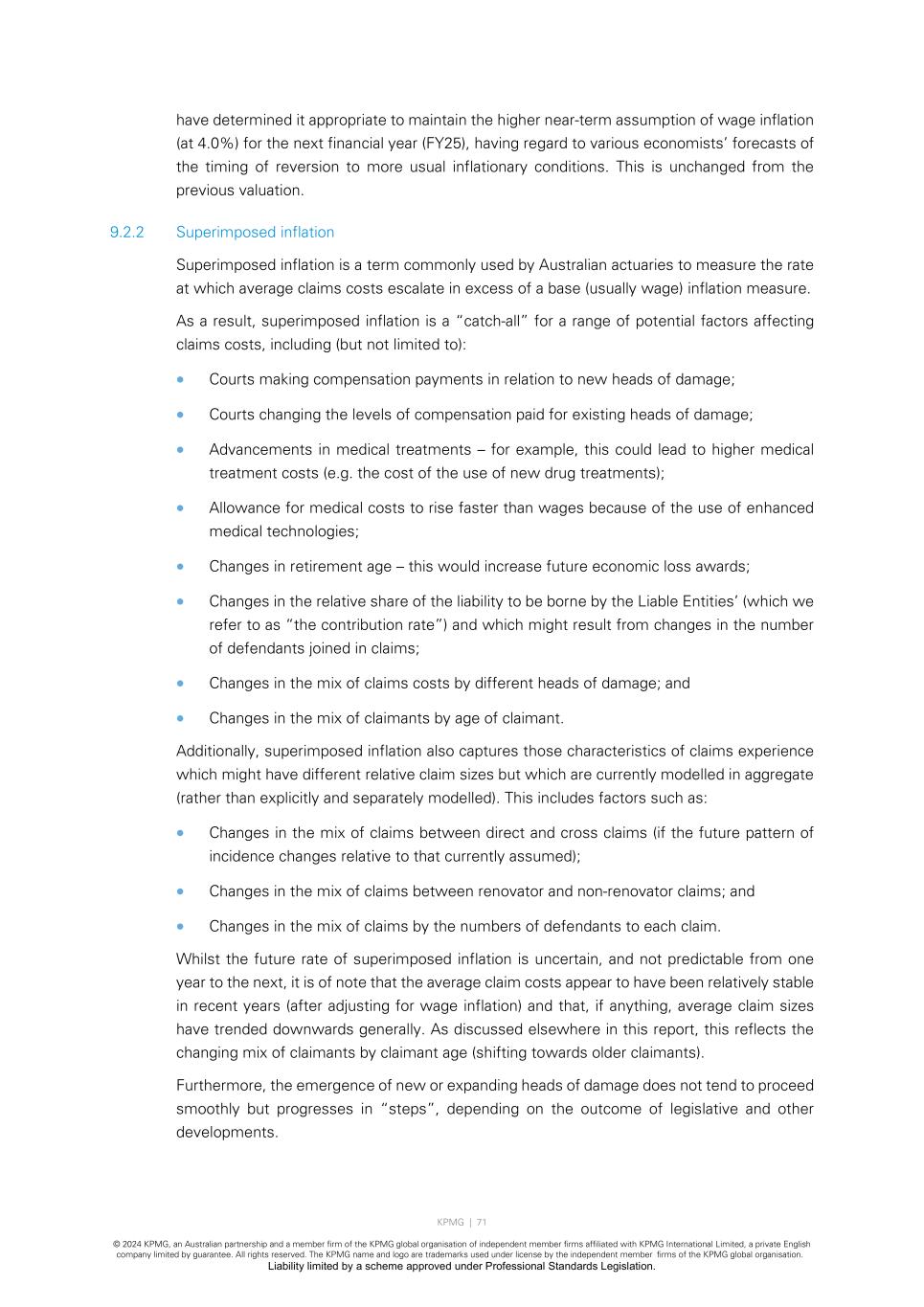 KPMG | 71 © 2024 KPMG, an Australian partnership and a member firm of the KPMG global organisation of independent member firms affiliated with KPMG International Limited, a private English company limited by guarantee. All rights reserved. The KPMG name and logo are trademarks used under license by the independent member firms of the KPMG global organisation. Liability limited by a scheme approved under Professional Standards Legislation. have determined it appropriate to maintain the higher near-term assumption of wage inflation (at 4.0%) for the next financial year (FY25), having regard to various economists’ forecasts of the timing of reversion to more usual inflationary conditions. This is unchanged from the previous valuation. 9.2.2 Superimposed inflation Superimposed inflation is a term commonly used by Australian actuaries to measure the rate at which average claims costs escalate in excess of a base (usually wage) inflation measure. As a result, superimposed inflation is a “catch-all” for a range of potential factors affecting claims costs, including (but not limited to): • Courts making compensation payments in relation to new heads of damage; • Courts changing the levels of compensation paid for existing heads of damage; • Advancements in medical treatments – for example, this could lead to higher medical treatment costs (e.g. the cost of the use of new drug treatments); • Allowance for medical costs to rise faster than wages because of the use of enhanced medical technologies; • Changes in retirement age – this would increase future economic loss awards; • Changes in the relative share of the liability to be borne by the Liable Entities’ (which we refer to as “the contribution rate”) and which might result from changes in the number of defendants joined in claims; • Changes in the mix of claims costs by different heads of damage; and • Changes in the mix of claimants by age of claimant. Additionally, superimposed inflation also captures those characteristics of claims experience which might have different relative claim sizes but which are currently modelled in aggregate (rather than explicitly and separately modelled). This includes factors such as: • Changes in the mix of claims between direct and cross claims (if the future pattern of incidence changes relative to that currently assumed); • Changes in the mix of claims between renovator and non-renovator claims; and • Changes in the mix of claims by the numbers of defendants to each claim. Whilst the future rate of superimposed inflation is uncertain, and not predictable from one year to the next, it is of note that the average claim costs appear to have been relatively stable in recent years (after adjusting for wage inflation) and that, if anything, average claim sizes have trended downwards generally. As discussed elsewhere in this report, this reflects the changing mix of claimants by claimant age (shifting towards older claimants). Furthermore, the emergence of new or expanding heads of damage does not tend to proceed smoothly but progresses in “steps”, depending on the outcome of legislative and other developments.