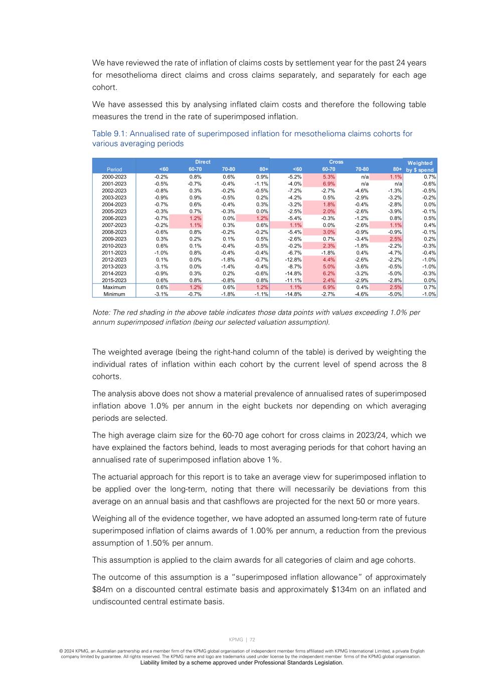KPMG | 72 © 2024 KPMG, an Australian partnership and a member firm of the KPMG global organisation of independent member firms affiliated with KPMG International Limited, a private English company limited by guarantee. All rights reserved. The KPMG name and logo are trademarks used under license by the independent member firms of the KPMG global organisation. Liability limited by a scheme approved under Professional Standards Legislation. We have reviewed the rate of inflation of claims costs by settlement year for the past 24 years for mesothelioma direct claims and cross claims separately, and separately for each age cohort. We have assessed this by analysing inflated claim costs and therefore the following table measures the trend in the rate of superimposed inflation. Table 9.1: Annualised rate of superimposed inflation for mesothelioma claims cohorts for various averaging periods Note: The red shading in the above table indicates those data points with values exceeding 1.0% per annum superimposed inflation (being our selected valuation assumption). The weighted average (being the right-hand column of the table) is derived by weighting the individual rates of inflation within each cohort by the current level of spend across the 8 cohorts. The analysis above does not show a material prevalence of annualised rates of superimposed inflation above 1.0% per annum in the eight buckets nor depending on which averaging periods are selected. The high average claim size for the 60-70 age cohort for cross claims in 2023/24, which we have explained the factors behind, leads to most averaging periods for that cohort having an annualised rate of superimposed inflation above 1%. The actuarial approach for this report is to take an average view for superimposed inflation to be applied over the long-term, noting that there will necessarily be deviations from this average on an annual basis and that cashflows are projected for the next 50 or more years. Weighing all of the evidence together, we have adopted an assumed long-term rate of future superimposed inflation of claims awards of 1.00% per annum, a reduction from the previous assumption of 1.50% per annum. This assumption is applied to the claim awards for all categories of claim and age cohorts. The outcome of this assumption is a “superimposed inflation allowance” of approximately $84m on a discounted central estimate basis and approximately $134m on an inflated and undiscounted central estimate basis. Period <60 60-70 70-80 80+ <60 60-70 70-80 80+ 2000-2023 -0.2% 0.8% 0.6% 0.9% -5.2% 5.3% n/a 1.1% 0.7% 2001-2023 -0.5% -0.7% -0.4% -1.1% -4.0% 6.9% n/a n/a -0.6% 2002-2023 -0.8% 0.3% -0.2% -0.5% -7.2% -2.7% -4.6% -1.3% -0.5% 2003-2023 -0.9% 0.9% -0.5% 0.2% -4.2% 0.5% -2.9% -3.2% -0.2% 2004-2023 -0.7% 0.6% -0.4% 0.3% -3.2% 1.8% -0.4% -2.8% 0.0% 2005-2023 -0.3% 0.7% -0.3% 0.0% -2.5% 2.0% -2.6% -3.9% -0.1% 2006-2023 -0.7% 1.2% 0.0% 1.2% -5.4% -0.3% -1.2% 0.8% 0.5% 2007-2023 -0.2% 1.1% 0.3% 0.6% 1.1% 0.0% -2.6% 1.1% 0.4% 2008-2023 -0.6% 0.8% -0.2% -0.2% -5.4% 3.0% -0.9% -0.9% -0.1% 2009-2023 0.3% 0.2% 0.1% 0.5% -2.6% 0.7% -3.4% 2.5% 0.2% 2010-2023 0.6% 0.1% -0.4% -0.5% -0.2% 2.3% -1.8% -2.2% -0.3% 2011-2023 -1.0% 0.8% -0.4% -0.4% -6.7% -1.8% 0.4% -4.7% -0.4% 2012-2023 0.1% 0.0% -1.8% -0.7% -12.8% 4.4% -2.6% -2.2% -1.0% 2013-2023 -3.1% 0.0% -1.4% -0.4% -8.7% 5.0% -3.6% -0.5% -1.0% 2014-2023 -0.9% 0.3% 0.2% -0.6% -14.8% 6.2% -3.2% -5.0% -0.3% 2015-2023 0.6% 0.8% -0.8% 0.8% -11.1% 2.4% -2.9% -2.8% 0.0% Maximum 0.6% 1.2% 0.6% 1.2% 1.1% 6.9% 0.4% 2.5% 0.7% Minimum -3.1% -0.7% -1.8% -1.1% -14.8% -2.7% -4.6% -5.0% -1.0% CrossDirect Weighted by $ spend