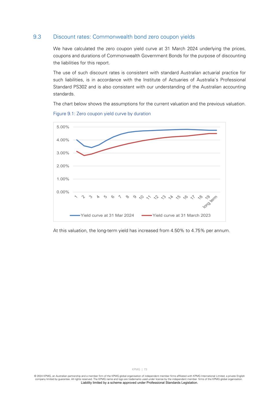 KPMG | 73 © 2024 KPMG, an Australian partnership and a member firm of the KPMG global organisation of independent member firms affiliated with KPMG International Limited, a private English company limited by guarantee. All rights reserved. The KPMG name and logo are trademarks used under license by the independent member firms of the KPMG global organisation. Liability limited by a scheme approved under Professional Standards Legislation. 9.3 Discount rates: Commonwealth bond zero coupon yields We have calculated the zero coupon yield curve at 31 March 2024 underlying the prices, coupons and durations of Commonwealth Government Bonds for the purpose of discounting the liabilities for this report. The use of such discount rates is consistent with standard Australian actuarial practice for such liabilities, is in accordance with the Institute of Actuaries of Australia’s Professional Standard PS302 and is also consistent with our understanding of the Australian accounting standards. The chart below shows the assumptions for the current valuation and the previous valuation. Figure 9.1: Zero coupon yield curve by duration At this valuation, the long-term yield has increased from 4.50% to 4.75% per annum. 0.00% 1.00% 2.00% 3.00% 4.00% 5.00% Yield curve at 31 Mar 2024 Yield curve at 31 March 2023