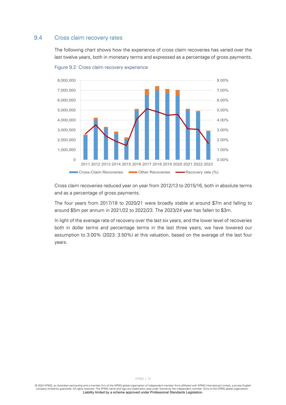 KPMG | 74 © 2024 KPMG, an Australian partnership and a member firm of the KPMG global organisation of independent member firms affiliated with KPMG International Limited, a private English company limited by guarantee. All rights reserved. The KPMG name and logo are trademarks used under license by the independent member firms of the KPMG global organisation. Liability limited by a scheme approved under Professional Standards Legislation. 9.4 Cross claim recovery rates The following chart shows how the experience of cross claim recoveries has varied over the last twelve years, both in monetary terms and expressed as a percentage of gross payments. Figure 9.2: Cross claim recovery experience Cross claim recoveries reduced year on year from 2012/13 to 2015/16, both in absolute terms and as a percentage of gross payments. The four years from 2017/18 to 2020/21 were broadly stable at around $7m and falling to around $5m per annum in 2021/22 to 2022/23. The 2023/24 year has fallen to $3m. In light of the average rate of recovery over the last six years, and the lower level of recoveries both in dollar terms and percentage terms in the last three years, we have lowered our assumption to 3.00% (2023: 3.50%) at this valuation, based on the average of the last four years. 0.00% 1.00% 2.00% 3.00% 4.00% 5.00% 6.00% 7.00% 8.00% 0 1,000,000 2,000,000 3,000,000 4,000,000 5,000,000 6,000,000 7,000,000 8,000,000 2011 2012 2013 2014 2015 2016 2017 2018 2019 2020 2021 2022 2023 Cross-Claim Recoveries Other Recoveries Recovery rate (%)