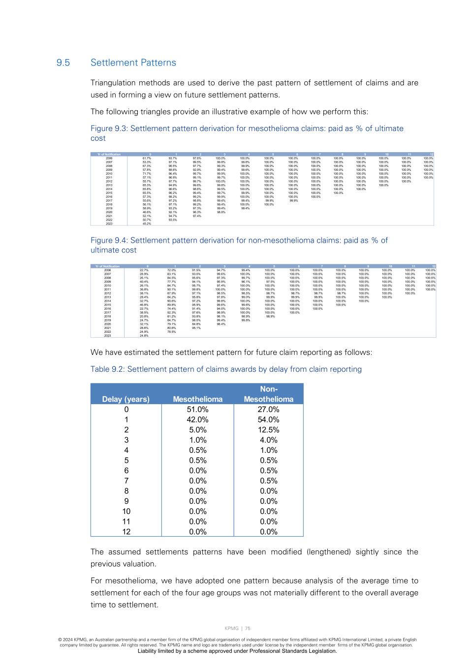 KPMG | 75 © 2024 KPMG, an Australian partnership and a member firm of the KPMG global organisation of independent member firms affiliated with KPMG International Limited, a private English company limited by guarantee. All rights reserved. The KPMG name and logo are trademarks used under license by the independent member firms of the KPMG global organisation. Liability limited by a scheme approved under Professional Standards Legislation. 9.5 Settlement Patterns Triangulation methods are used to derive the past pattern of settlement of claims and are used in forming a view on future settlement patterns. The following triangles provide an illustrative example of how we perform this: Figure 9.3: Settlement pattern derivation for mesothelioma claims: paid as % of ultimate cost Figure 9.4: Settlement pattern derivation for non-mesothelioma claims: paid as % of ultimate cost We have estimated the settlement pattern for future claim reporting as follows: Table 9.2: Settlement pattern of claims awards by delay from claim reporting The assumed settlements patterns have been modified (lengthened) sightly since the previous valuation. For mesothelioma, we have adopted one pattern because analysis of the average time to settlement for each of the four age groups was not materially different to the overall average time to settlement. Yr of Notification 0 1 2 3 4 5 6 7 8 9 10 11 12 2006 61.7% 93.7% 97.6% 100.0% 100.0% 100.0% 100.0% 100.0% 100.0% 100.0% 100.0% 100.0% 100.0% 2007 53.3% 97.1% 99.5% 99.8% 99.8% 100.0% 100.0% 100.0% 100.0% 100.0% 100.0% 100.0% 100.0% 2008 67.3% 96.5% 97.7% 99.3% 99.9% 100.0% 100.0% 100.0% 100.0% 100.0% 100.0% 100.0% 100.0% 2009 57.8% 88.6% 92.9% 99.4% 99.6% 100.0% 100.0% 100.0% 100.0% 100.0% 100.0% 100.0% 100.0% 2010 71.7% 96.4% 99.7% 99.9% 100.0% 100.0% 100.0% 100.0% 100.0% 100.0% 100.0% 100.0% 100.0% 2011 57.1% 96.9% 99.1% 99.7% 100.0% 100.0% 100.0% 100.0% 100.0% 100.0% 100.0% 100.0% 100.0% 2012 55.7% 97.7% 99.7% 100.0% 100.0% 100.0% 100.0% 100.0% 100.0% 100.0% 100.0% 100.0% 2013 65.3% 94.9% 99.6% 99.8% 100.0% 100.0% 100.0% 100.0% 100.0% 100.0% 100.0% 2014 65.8% 96.6% 98.6% 99.5% 100.0% 100.0% 100.0% 100.0% 100.0% 100.0% 2015 65.5% 96.2% 99.4% 99.7% 99.9% 100.0% 100.0% 100.0% 100.0% 2016 57.3% 98.2% 99.2% 99.9% 100.0% 100.0% 100.0% 100.0% 2017 55.6% 97.2% 98.8% 99.4% 99.4% 99.9% 99.9% 2018 56.1% 97.1% 99.2% 99.4% 100.0% 100.0% 2019 58.9% 93.2% 97.3% 99.4% 99.4% 2020 46.6% 92.1% 96.3% 98.8% 2021 52.1% 94.7% 97.4% 2022 50.7% 93.5% 2023 45.2% Yr of Notification 0 1 2 3 4 5 6 7 8 9 10 11 12 2006 22.7% 72.0% 91.5% 94.7% 99.4% 100.0% 100.0% 100.0% 100.0% 100.0% 100.0% 100.0% 100.0% 2007 28.9% 83.1% 93.0% 99.6% 100.0% 100.0% 100.0% 100.0% 100.0% 100.0% 100.0% 100.0% 100.0% 2008 26.1% 84.5% 95.6% 97.3% 99.7% 100.0% 100.0% 100.0% 100.0% 100.0% 100.0% 100.0% 100.0% 2009 40.4% 77.7% 94.1% 95.9% 96.1% 97.5% 100.0% 100.0% 100.0% 100.0% 100.0% 100.0% 100.0% 2010 26.1% 84.7% 95.7% 97.4% 100.0% 100.0% 100.0% 100.0% 100.0% 100.0% 100.0% 100.0% 100.0% 2011 36.8% 90.1% 99.8% 100.0% 100.0% 100.0% 100.0% 100.0% 100.0% 100.0% 100.0% 100.0% 100.0% 2012 38.1% 87.9% 97.1% 98.5% 98.5% 98.7% 98.7% 98.7% 98.7% 100.0% 100.0% 100.0% 2013 28.4% 84.2% 95.8% 97.8% 99.0% 99.9% 99.9% 99.9% 100.0% 100.0% 100.0% 2014 32.7% 90.6% 97.2% 99.8% 100.0% 100.0% 100.0% 100.0% 100.0% 100.0% 2015 46.8% 89.8% 95.9% 99.6% 99.6% 100.0% 100.0% 100.0% 100.0% 2016 22.7% 74.4% 91.4% 94.0% 100.0% 100.0% 100.0% 100.0% 2017 38.5% 92.3% 97.6% 98.9% 100.0% 100.0% 100.0% 2018 20.8% 81.2% 93.8% 98.1% 98.9% 98.9% 2019 24.7% 84.7% 98.0% 99.4% 99.8% 2020 32.1% 79.1% 84.8% 98.4% 2021 28.6% 80.6% 95.1% 2022 24.9% 78.5% 2023 24.8% Delay (years) Mesothelioma Non- Mesothelioma 0 51.0% 27.0% 1 42.0% 54.0% 2 5.0% 12.5% 3 1.0% 4.0% 4 0.5% 1.0% 5 0.5% 0.5% 6 0.0% 0.5% 7 0.0% 0.5% 8 0.0% 0.0% 9 0.0% 0.0% 10 0.0% 0.0% 11 0.0% 0.0% 12 0.0% 0.0%
