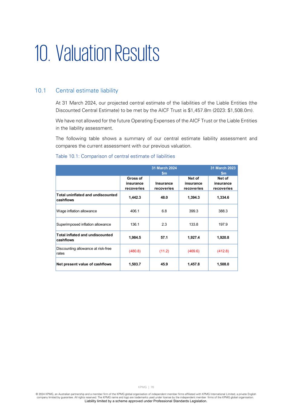 KPMG | 76 © 2024 KPMG, an Australian partnership and a member firm of the KPMG global organisation of independent member firms affiliated with KPMG International Limited, a private English company limited by guarantee. All rights reserved. The KPMG name and logo are trademarks used under license by the independent member firms of the KPMG global organisation. Liability limited by a scheme approved under Professional Standards Legislation. 10. Valuation Results 10.1 Central estimate liability At 31 March 2024, our projected central estimate of the liabilities of the Liable Entities (the Discounted Central Estimate) to be met by the AICF Trust is $1,457.8m (2023: $1,508.0m). We have not allowed for the future Operating Expenses of the AICF Trust or the Liable Entities in the liability assessment. The following table shows a summary of our central estimate liability assessment and compares the current assessment with our previous valuation. Table 10.1: Comparison of central estimate of liabilities 31 March 2023 $m Gross of insurance recoveries Insurance recoveries Net of insurance recoveries Net of insurance recoveries Total uninflated and undiscounted cashflows 1,442.3 48.0 1,394.3 1,334.6 Wage inflation allowance 406.1 6.8 399.3 388.3 Superimposed inflation allowance 136.1 2.3 133.8 197.9 Total inflated and undiscounted cashflows 1,984.5 57.1 1,927.4 1,920.8 Discounting allowance at risk-free rates (480.8) (11.2) (469.6) (412.8) Net present value of cashflows 1,503.7 45.9 1,457.8 1,508.0 31 March 2024 $m