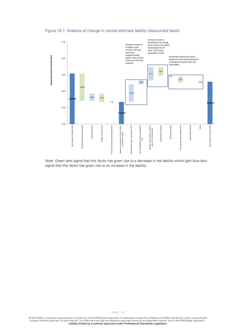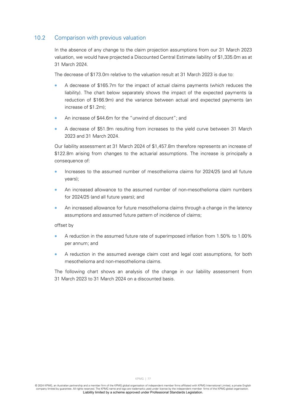 KPMG | 77 © 2024 KPMG, an Australian partnership and a member firm of the KPMG global organisation of independent member firms affiliated with KPMG International Limited, a private English company limited by guarantee. All rights reserved. The KPMG name and logo are trademarks used under license by the independent member firms of the KPMG global organisation. Liability limited by a scheme approved under Professional Standards Legislation. 10.2 Comparison with previous valuation In the absence of any change to the claim projection assumptions from our 31 March 2023 valuation, we would have projected a Discounted Central Estimate liability of $1,335.0m as at 31 March 2024. The decrease of $173.0m relative to the valuation result at 31 March 2023 is due to: • A decrease of $165.7m for the impact of actual claims payments (which reduces the liability). The chart below separately shows the impact of the expected payments (a reduction of $166.9m) and the variance between actual and expected payments (an increase of $1.2m); • An increase of $44.6m for the “unwind of discount”; and • A decrease of $51.9m resulting from increases to the yield curve between 31 March 2023 and 31 March 2024. Our liability assessment at 31 March 2024 of $1,457.8m therefore represents an increase of $122.8m arising from changes to the actuarial assumptions. The increase is principally a consequence of: • Increases to the assumed number of mesothelioma claims for 2024/25 (and all future years); • An increased allowance to the assumed number of non-mesothelioma claim numbers for 2024/25 (and all future years); and • An increased allowance for future mesothelioma claims through a change in the latency assumptions and assumed future pattern of incidence of claims; offset by • A reduction in the assumed future rate of superimposed inflation from 1.50% to 1.00% per annum; and • A reduction in the assumed average claim cost and legal cost assumptions, for both mesothelioma and non-mesothelioma claims. The following chart shows an analysis of the change in our liability assessment from 31 March 2023 to 31 March 2024 on a discounted basis.