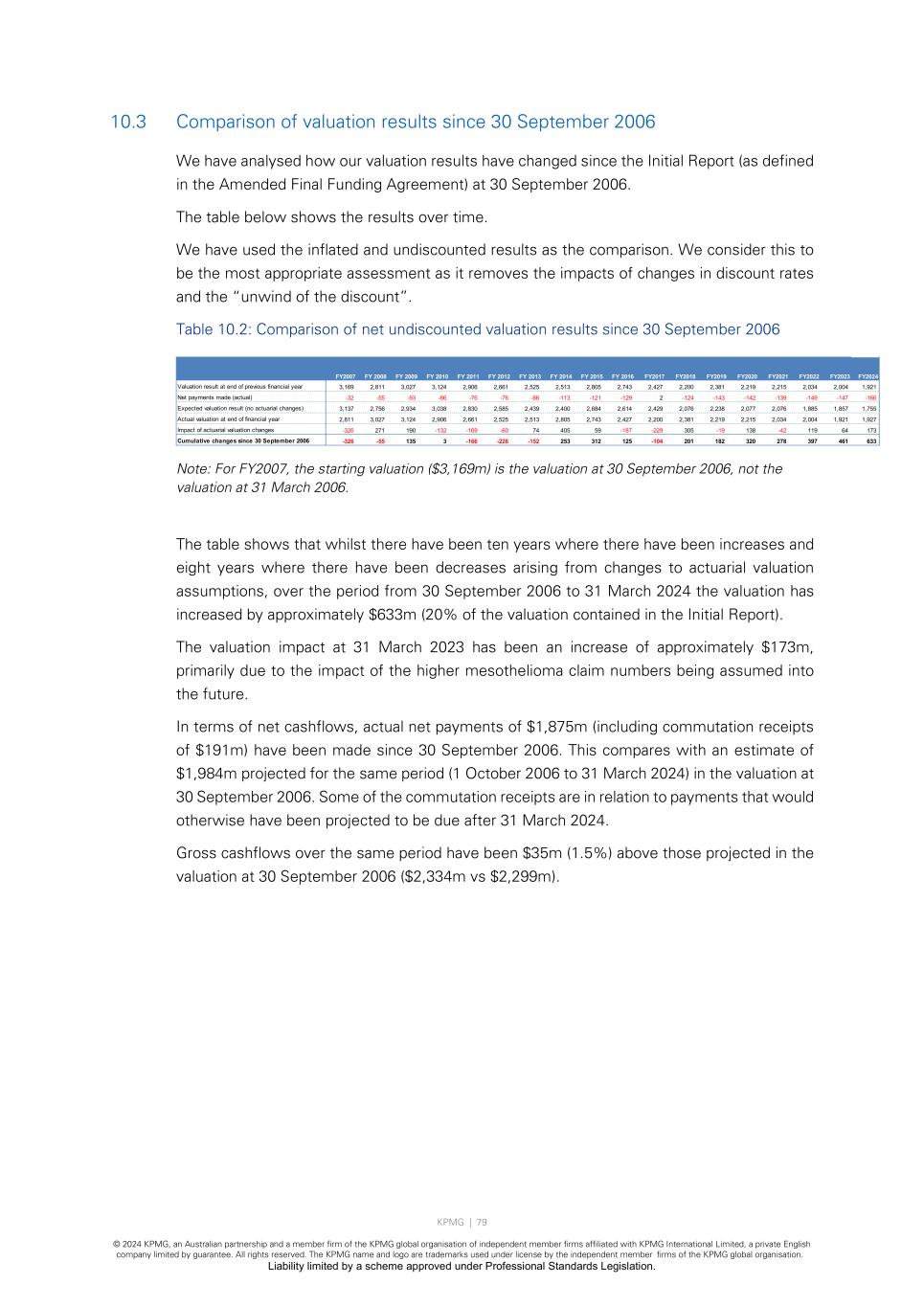 KPMG | 79 © 2024 KPMG, an Australian partnership and a member firm of the KPMG global organisation of independent member firms affiliated with KPMG International Limited, a private English company limited by guarantee. All rights reserved. The KPMG name and logo are trademarks used under license by the independent member firms of the KPMG global organisation. Liability limited by a scheme approved under Professional Standards Legislation. 10.3 Comparison of valuation results since 30 September 2006 We have analysed how our valuation results have changed since the Initial Report (as defined in the Amended Final Funding Agreement) at 30 September 2006. The table below shows the results over time. We have used the inflated and undiscounted results as the comparison. We consider this to be the most appropriate assessment as it removes the impacts of changes in discount rates and the “unwind of the discount”. Table 10.2: Comparison of net undiscounted valuation results since 30 September 2006 Note: For FY2007, the starting valuation ($3,169m) is the valuation at 30 September 2006, not the valuation at 31 March 2006. The table shows that whilst there have been ten years where there have been increases and eight years where there have been decreases arising from changes to actuarial valuation assumptions, over the period from 30 September 2006 to 31 March 2024 the valuation has increased by approximately $633m (20% of the valuation contained in the Initial Report). The valuation impact at 31 March 2023 has been an increase of approximately $173m, primarily due to the impact of the higher mesothelioma claim numbers being assumed into the future. In terms of net cashflows, actual net payments of $1,875m (including commutation receipts of $191m) have been made since 30 September 2006. This compares with an estimate of $1,984m projected for the same period (1 October 2006 to 31 March 2024) in the valuation at 30 September 2006. Some of the commutation receipts are in relation to payments that would otherwise have been projected to be due after 31 March 2024. Gross cashflows over the same period have been $35m (1.5%) above those projected in the valuation at 30 September 2006 ($2,334m vs $2,299m). FY2007 FY 2008 FY 2009 FY 2010 FY 2011 FY 2012 FY 2013 FY 2014 FY 2015 FY 2016 FY2017 FY2018 FY2019 FY2020 FY2021 FY2022 FY2023 FY2024 Valuation result at end of previous financial year 3,169 2,811 3,027 3,124 2,906 2,661 2,525 2,513 2,805 2,743 2,427 2,200 2,381 2,219 2,215 2,034 2,004 1,921 Net payments made (actual) -32 -55 -93 -86 -76 -76 -86 -113 -121 -129 2 -124 -143 -142 -139 -149 -147 -166 Expected valuation result (no actuarial changes) 3,137 2,756 2,934 3,038 2,830 2,585 2,439 2,400 2,684 2,614 2,429 2,076 2,238 2,077 2,076 1,885 1,857 1,755 Actual valuation at end of financial year 2,811 3,027 3,124 2,906 2,661 2,525 2,513 2,805 2,743 2,427 2,200 2,381 2,219 2,215 2,034 2,004 1,921 1,927 Impact of actuarial valuation changes -326 271 190 -132 -169 -60 74 405 59 -187 -229 305 -19 138 -42 119 64 173 Cumulative changes since 30 September 2006 -326 -55 135 3 -166 -226 -152 253 312 125 -104 201 182 320 278 397 461 633