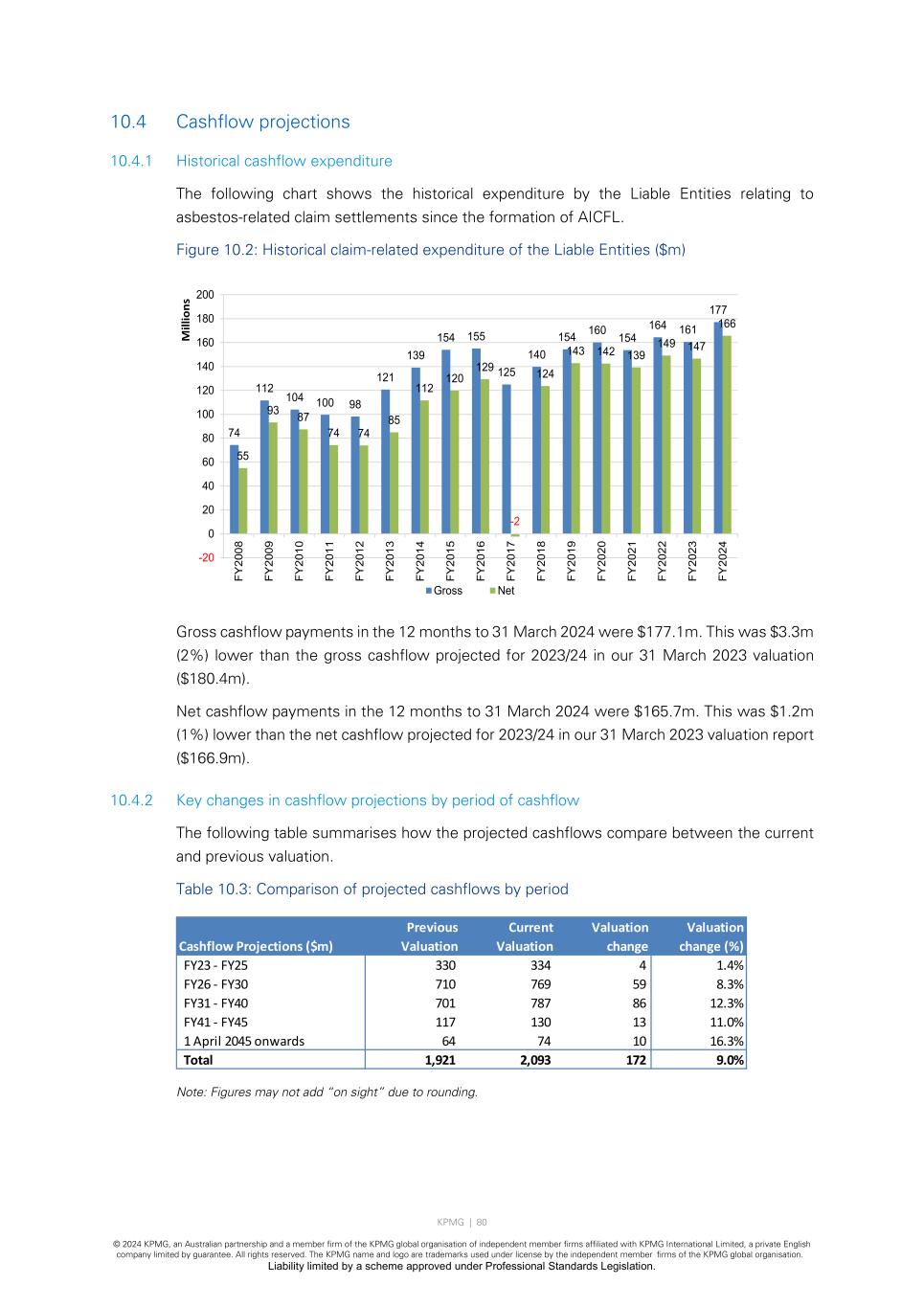 KPMG | 80 © 2024 KPMG, an Australian partnership and a member firm of the KPMG global organisation of independent member firms affiliated with KPMG International Limited, a private English company limited by guarantee. All rights reserved. The KPMG name and logo are trademarks used under license by the independent member firms of the KPMG global organisation. Liability limited by a scheme approved under Professional Standards Legislation. 10.4 Cashflow projections 10.4.1 Historical cashflow expenditure The following chart shows the historical expenditure by the Liable Entities relating to asbestos-related claim settlements since the formation of AICFL. Figure 10.2: Historical claim-related expenditure of the Liable Entities ($m) Gross cashflow payments in the 12 months to 31 March 2024 were $177.1m. This was $3.3m (2%) lower than the gross cashflow projected for 2023/24 in our 31 March 2023 valuation ($180.4m). Net cashflow payments in the 12 months to 31 March 2024 were $165.7m. This was $1.2m (1%) lower than the net cashflow projected for 2023/24 in our 31 March 2023 valuation report ($166.9m). 10.4.2 Key changes in cashflow projections by period of cashflow The following table summarises how the projected cashflows compare between the current and previous valuation. Table 10.3: Comparison of projected cashflows by period Note: Figures may not add “on sight” due to rounding. 74 112 104 100 98 121 139 154 155 125 140 154 160 154 164 161 177 55 93 87 74 74 85 112 120 129 -2 124 143 142 139 149 147 166 -20 0 20 40 60 80 100 120 140 160 180 200 FY 20 08 FY 20 09 FY 20 10 FY 20 11 FY 20 12 FY 20 13 FY 20 14 FY 20 15 FY 20 16 FY 20 17 FY 20 18 FY 20 19 FY 20 20 FY 20 21 FY 20 22 FY 20 23 FY 20 24 M ill io ns Gross Net Cashflow Projections ($m) Previous Valuation Current Valuation Valuation change Valuation change (%) FY23 - FY25 330 334 4 1.4% FY26 - FY30 710 769 59 8.3% FY31 - FY40 701 787 86 12.3% FY41 - FY45 117 130 13 11.0% 1 April 2045 onwards 64 74 10 16.3% Total 1,921 2,093 172 9.0%