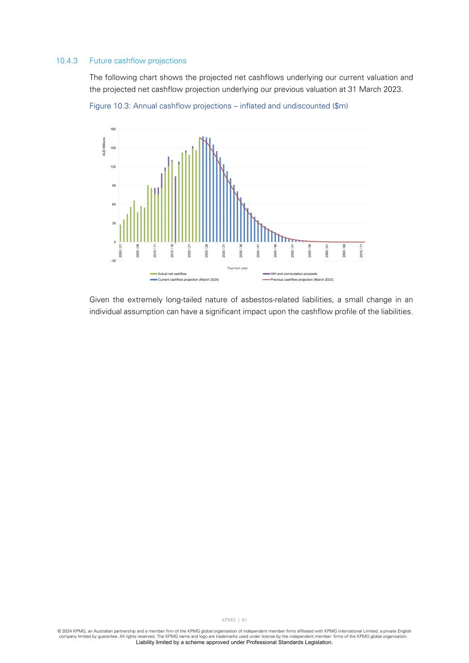 KPMG | 81 © 2024 KPMG, an Australian partnership and a member firm of the KPMG global organisation of independent member firms affiliated with KPMG International Limited, a private English company limited by guarantee. All rights reserved. The KPMG name and logo are trademarks used under license by the independent member firms of the KPMG global organisation. Liability limited by a scheme approved under Professional Standards Legislation. 10.4.3 Future cashflow projections The following chart shows the projected net cashflows underlying our current valuation and the projected net cashflow projection underlying our previous valuation at 31 March 2023. Figure 10.3: Annual cashflow projections – inflated and undiscounted ($m) Given the extremely long-tailed nature of asbestos-related liabilities, a small change in an individual assumption can have a significant impact upon the cashflow profile of the liabilities. -30 0 30 60 90 120 150 180 20 00 / 01 20 05 / 06 20 10 / 11 20 15 / 16 20 20 / 21 20 25 / 26 20 30 / 31 20 35 / 36 20 40 / 41 20 45 / 46 20 50 / 51 20 55 / 56 20 60 / 61 20 65 / 66 20 70 / 71 AU D M illi on s Payment year Actual net cashflow HIH and commutation proceeds Current cashflow projection (March 2024) Previous cashflow projection (March 2023)