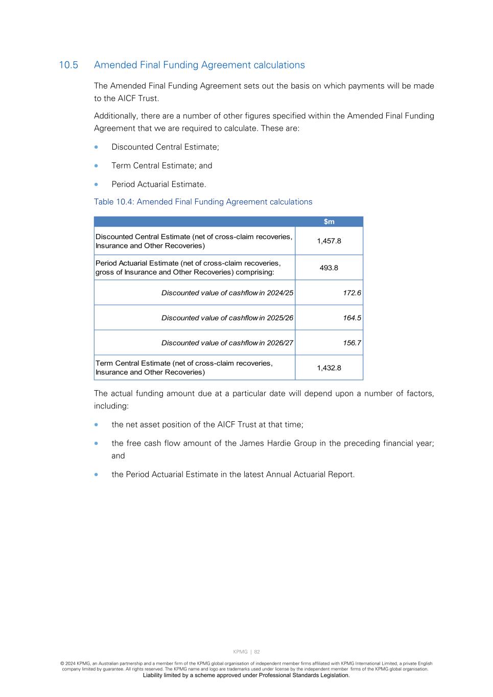 KPMG | 82 © 2024 KPMG, an Australian partnership and a member firm of the KPMG global organisation of independent member firms affiliated with KPMG International Limited, a private English company limited by guarantee. All rights reserved. The KPMG name and logo are trademarks used under license by the independent member firms of the KPMG global organisation. Liability limited by a scheme approved under Professional Standards Legislation. 10.5 Amended Final Funding Agreement calculations The Amended Final Funding Agreement sets out the basis on which payments will be made to the AICF Trust. Additionally, there are a number of other figures specified within the Amended Final Funding Agreement that we are required to calculate. These are: • Discounted Central Estimate; • Term Central Estimate; and • Period Actuarial Estimate. Table 10.4: Amended Final Funding Agreement calculations The actual funding amount due at a particular date will depend upon a number of factors, including: • the net asset position of the AICF Trust at that time; • the free cash flow amount of the James Hardie Group in the preceding financial year; and • the Period Actuarial Estimate in the latest Annual Actuarial Report. $m Discounted Central Estimate (net of cross-claim recoveries, Insurance and Other Recoveries) 1,457.8 Period Actuarial Estimate (net of cross-claim recoveries, gross of Insurance and Other Recoveries) comprising: 493.8 Discounted value of cashflow in 2024/25 172.6 Discounted value of cashflow in 2025/26 164.5 Discounted value of cashflow in 2026/27 156.7 Term Central Estimate (net of cross-claim recoveries, Insurance and Other Recoveries) 1,432.8