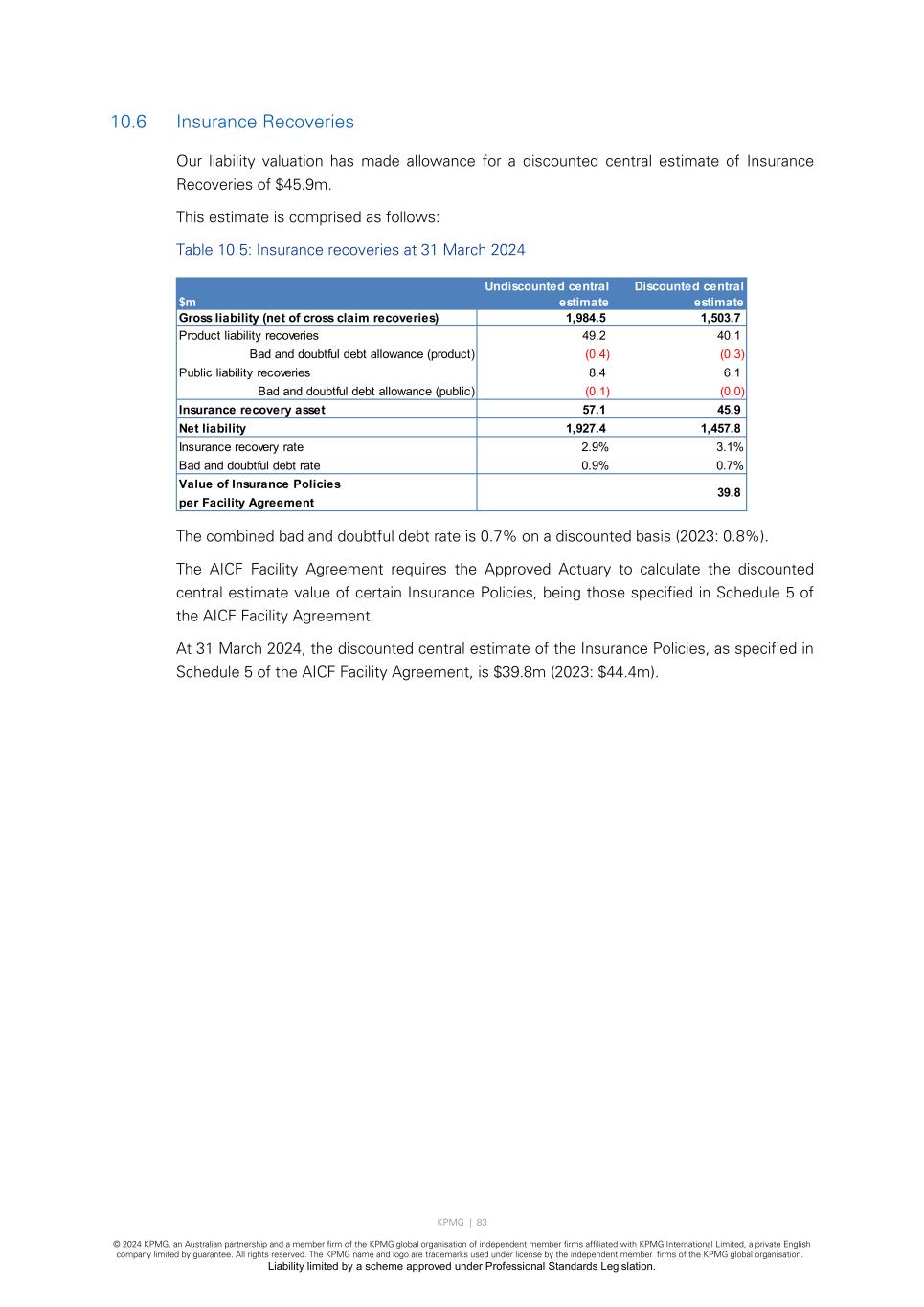 KPMG | 83 © 2024 KPMG, an Australian partnership and a member firm of the KPMG global organisation of independent member firms affiliated with KPMG International Limited, a private English company limited by guarantee. All rights reserved. The KPMG name and logo are trademarks used under license by the independent member firms of the KPMG global organisation. Liability limited by a scheme approved under Professional Standards Legislation. 10.6 Insurance Recoveries Our liability valuation has made allowance for a discounted central estimate of Insurance Recoveries of $45.9m. This estimate is comprised as follows: Table 10.5: Insurance recoveries at 31 March 2024 The combined bad and doubtful debt rate is 0.7% on a discounted basis (2023: 0.8%). The AICF Facility Agreement requires the Approved Actuary to calculate the discounted central estimate value of certain Insurance Policies, being those specified in Schedule 5 of the AICF Facility Agreement. At 31 March 2024, the discounted central estimate of the Insurance Policies, as specified in Schedule 5 of the AICF Facility Agreement, is $39.8m (2023: $44.4m). $m Undiscounted central estimate Discounted central estimate Gross liability (net of cross claim recoveries) 1,984.5 1,503.7 Product liability recoveries 49.2 40.1 Bad and doubtful debt allowance (product) (0.4) (0.3) Public liability recoveries 8.4 6.1 Bad and doubtful debt allowance (public) (0.1) (0.0) Insurance recovery asset 57.1 45.9 Net liability 1,927.4 1,457.8 Insurance recovery rate 2.9% 3.1% Bad and doubtful debt rate 0.9% 0.7% Value of Insurance Policies per Facility Agreement 39.8
