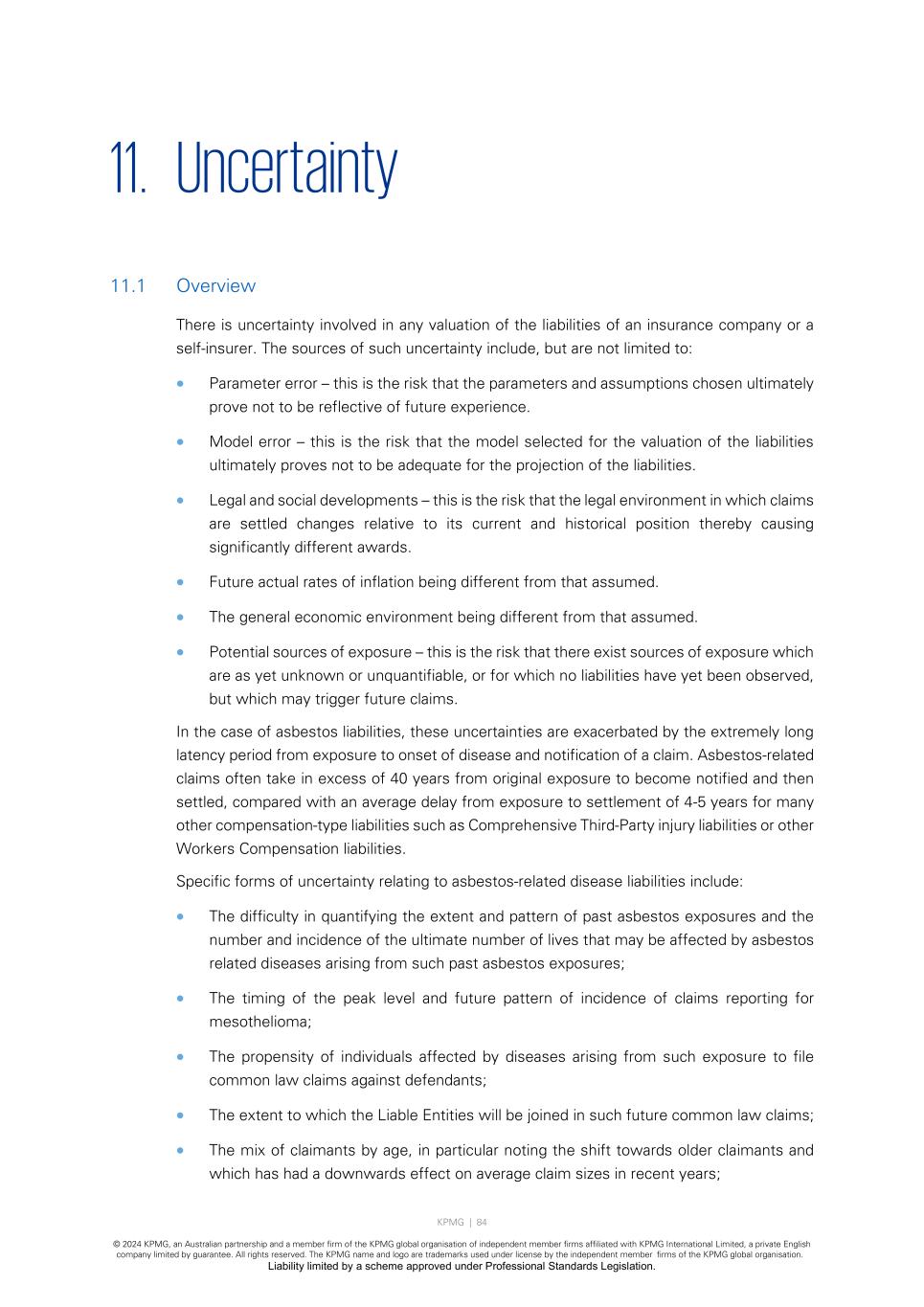 KPMG | 84 © 2024 KPMG, an Australian partnership and a member firm of the KPMG global organisation of independent member firms affiliated with KPMG International Limited, a private English company limited by guarantee. All rights reserved. The KPMG name and logo are trademarks used under license by the independent member firms of the KPMG global organisation. Liability limited by a scheme approved under Professional Standards Legislation. 11. Uncertainty 11.1 Overview There is uncertainty involved in any valuation of the liabilities of an insurance company or a self-insurer. The sources of such uncertainty include, but are not limited to: • Parameter error – this is the risk that the parameters and assumptions chosen ultimately prove not to be reflective of future experience. • Model error – this is the risk that the model selected for the valuation of the liabilities ultimately proves not to be adequate for the projection of the liabilities. • Legal and social developments – this is the risk that the legal environment in which claims are settled changes relative to its current and historical position thereby causing significantly different awards. • Future actual rates of inflation being different from that assumed. • The general economic environment being different from that assumed. • Potential sources of exposure – this is the risk that there exist sources of exposure which are as yet unknown or unquantifiable, or for which no liabilities have yet been observed, but which may trigger future claims. In the case of asbestos liabilities, these uncertainties are exacerbated by the extremely long latency period from exposure to onset of disease and notification of a claim. Asbestos-related claims often take in excess of 40 years from original exposure to become notified and then settled, compared with an average delay from exposure to settlement of 4-5 years for many other compensation-type liabilities such as Comprehensive Third-Party injury liabilities or other Workers Compensation liabilities. Specific forms of uncertainty relating to asbestos-related disease liabilities include: • The difficulty in quantifying the extent and pattern of past asbestos exposures and the number and incidence of the ultimate number of lives that may be affected by asbestos related diseases arising from such past asbestos exposures; • The timing of the peak level and future pattern of incidence of claims reporting for mesothelioma; • The propensity of individuals affected by diseases arising from such exposure to file common law claims against defendants; • The extent to which the Liable Entities will be joined in such future common law claims; • The mix of claimants by age, in particular noting the shift towards older claimants and which has had a downwards effect on average claim sizes in recent years;