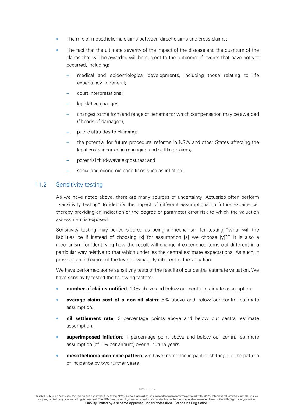 KPMG | 85 © 2024 KPMG, an Australian partnership and a member firm of the KPMG global organisation of independent member firms affiliated with KPMG International Limited, a private English company limited by guarantee. All rights reserved. The KPMG name and logo are trademarks used under license by the independent member firms of the KPMG global organisation. Liability limited by a scheme approved under Professional Standards Legislation. • The mix of mesothelioma claims between direct claims and cross claims; • The fact that the ultimate severity of the impact of the disease and the quantum of the claims that will be awarded will be subject to the outcome of events that have not yet occurred, including: – medical and epidemiological developments, including those relating to life expectancy in general; – court interpretations; – legislative changes; – changes to the form and range of benefits for which compensation may be awarded (“heads of damage”); – public attitudes to claiming; – the potential for future procedural reforms in NSW and other States affecting the legal costs incurred in managing and settling claims; – potential third-wave exposures; and – social and economic conditions such as inflation. 11.2 Sensitivity testing As we have noted above, there are many sources of uncertainty. Actuaries often perform “sensitivity testing” to identify the impact of different assumptions on future experience, thereby providing an indication of the degree of parameter error risk to which the valuation assessment is exposed. Sensitivity testing may be considered as being a mechanism for testing “what will the liabilities be if instead of choosing [x] for assumption [a] we choose [y]?” It is also a mechanism for identifying how the result will change if experience turns out different in a particular way relative to that which underlies the central estimate expectations. As such, it provides an indication of the level of variability inherent in the valuation. We have performed some sensitivity tests of the results of our central estimate valuation. We have sensitivity tested the following factors: • number of claims notified: 10% above and below our central estimate assumption. • average claim cost of a non-nil claim: 5% above and below our central estimate assumption. • nil settlement rate: 2 percentage points above and below our central estimate assumption. • superimposed inflation: 1 percentage point above and below our central estimate assumption (of 1% per annum) over all future years. • mesothelioma incidence pattern: we have tested the impact of shifting out the pattern of incidence by two further years.